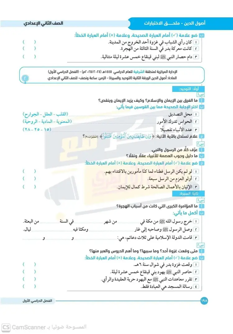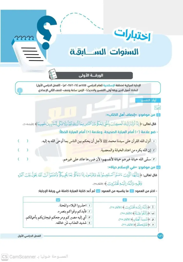 ينشر «شبابيك» امتحانات كتاب سلاح الأزهري في مقرر أصول الدين لطلاب الصف الثاني الإعدادي الأزهري بالفصل الدراسي الأول للعام 2025 2026، حتى يتثنى للطلاب التدرب على حلها.
