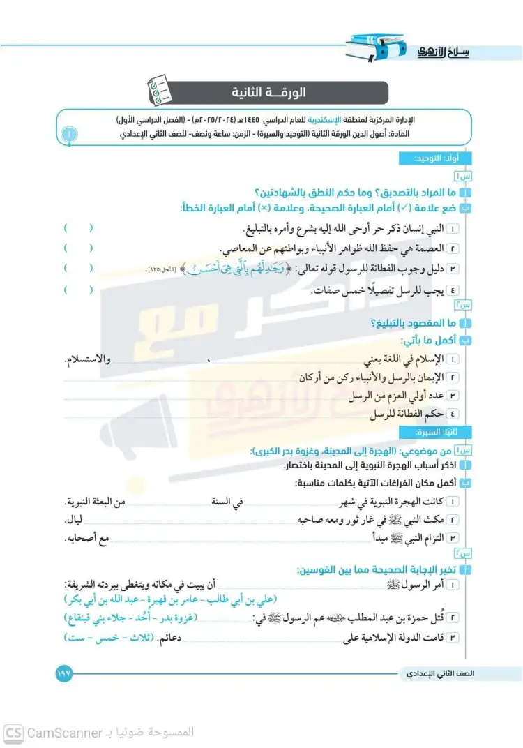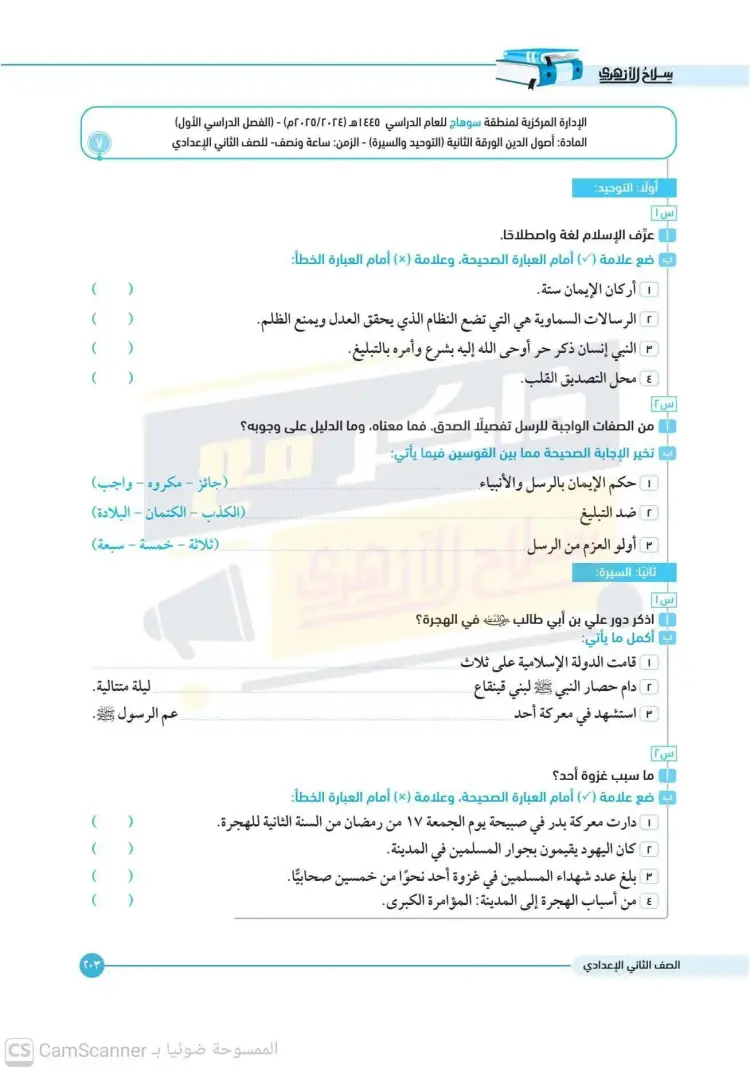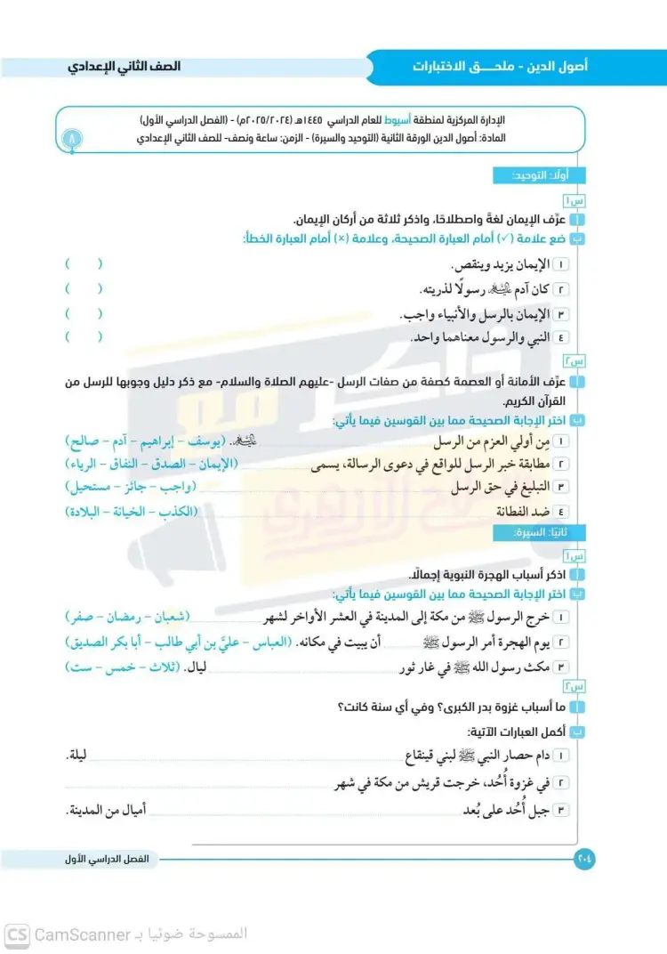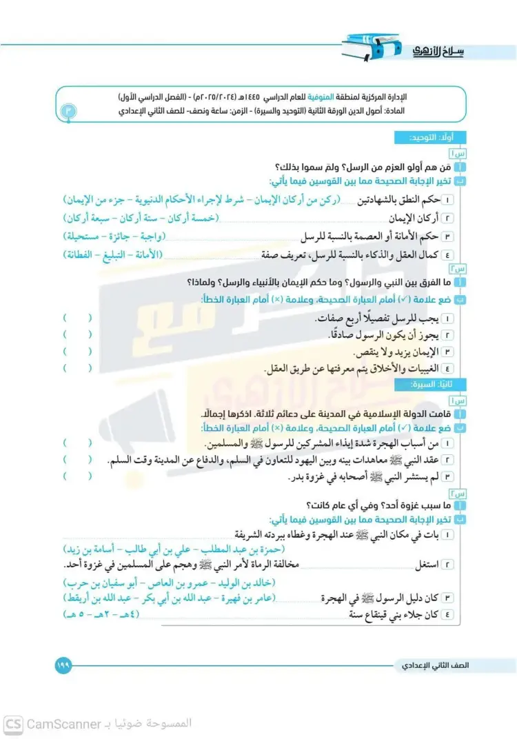 امتحانات كتاب سلاح الأزهري أصول دين للصف الثاني الإعدادي الترم الأول 2026