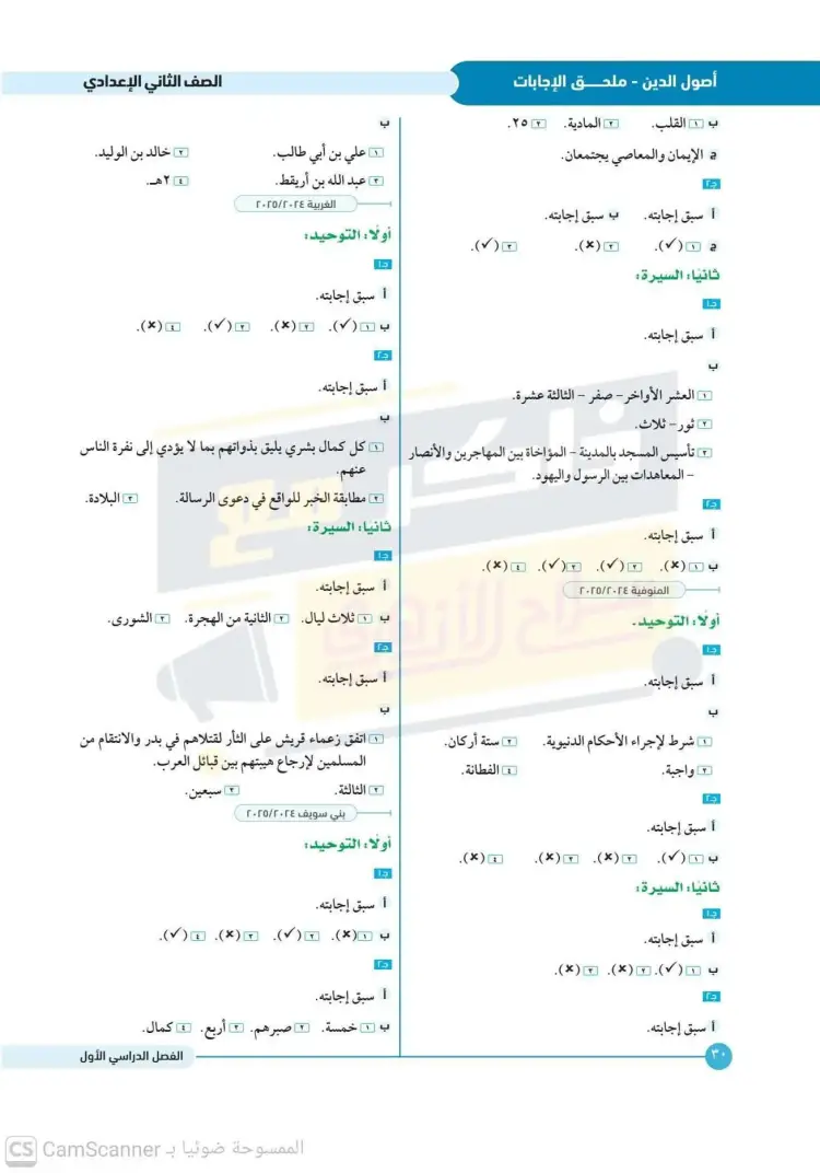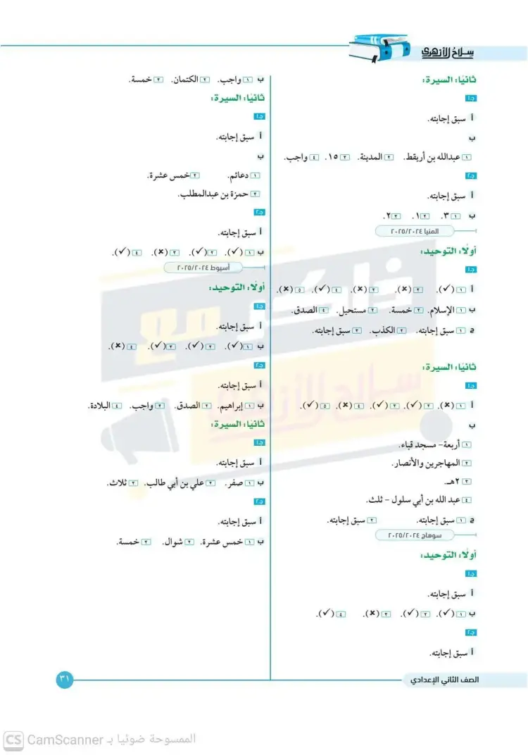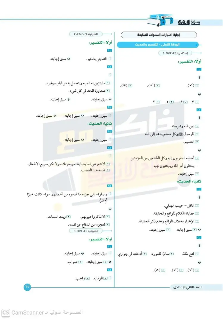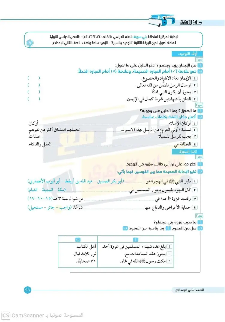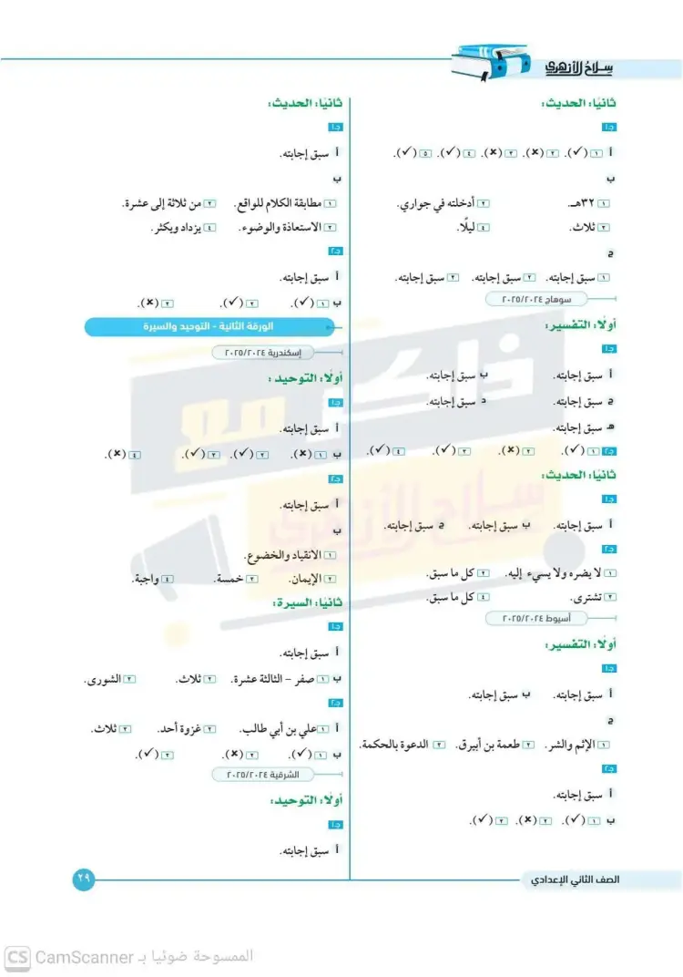 امتحانات كتاب سلاح الأزهري أصول دين للصف الثاني الإعدادي الترم الأول 2026