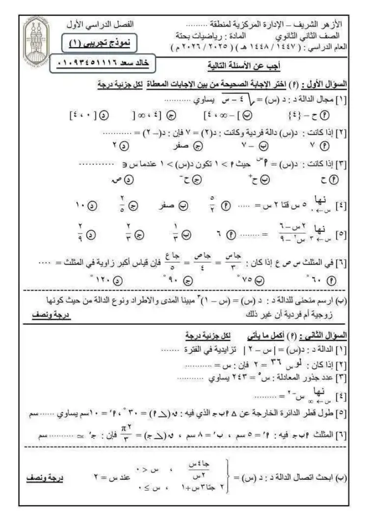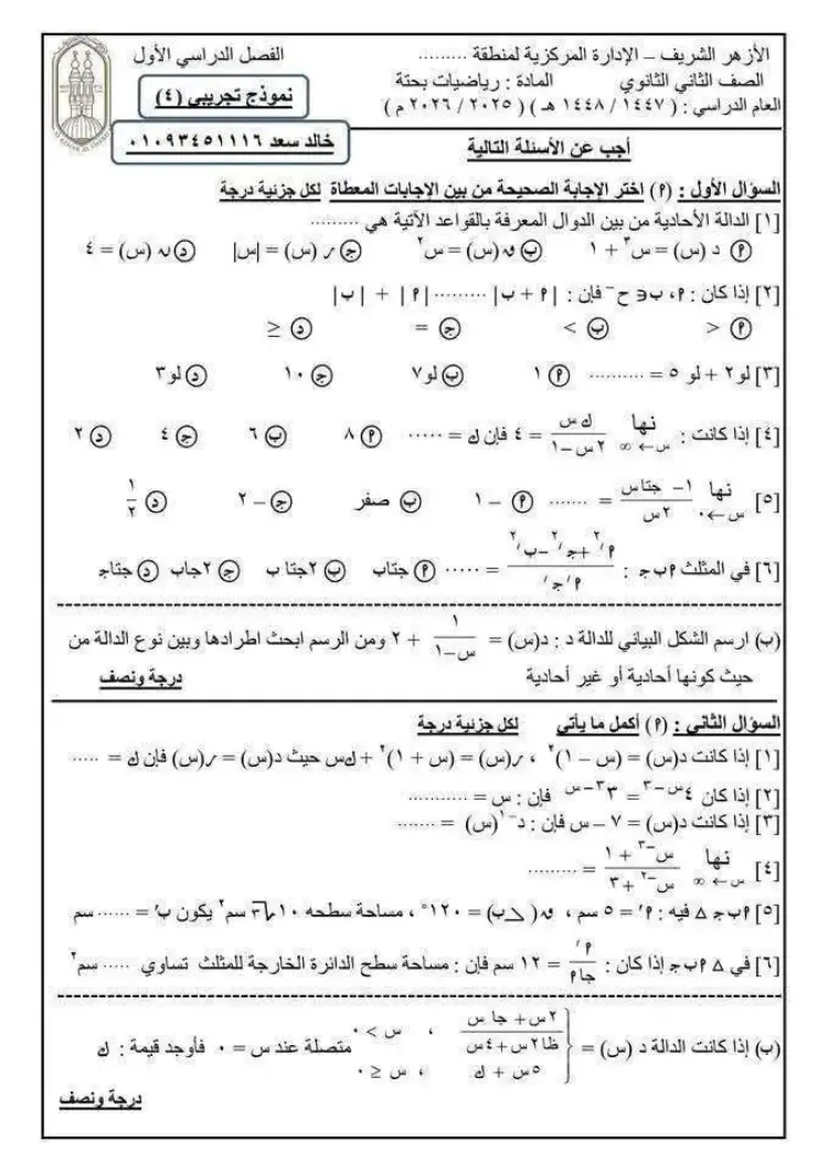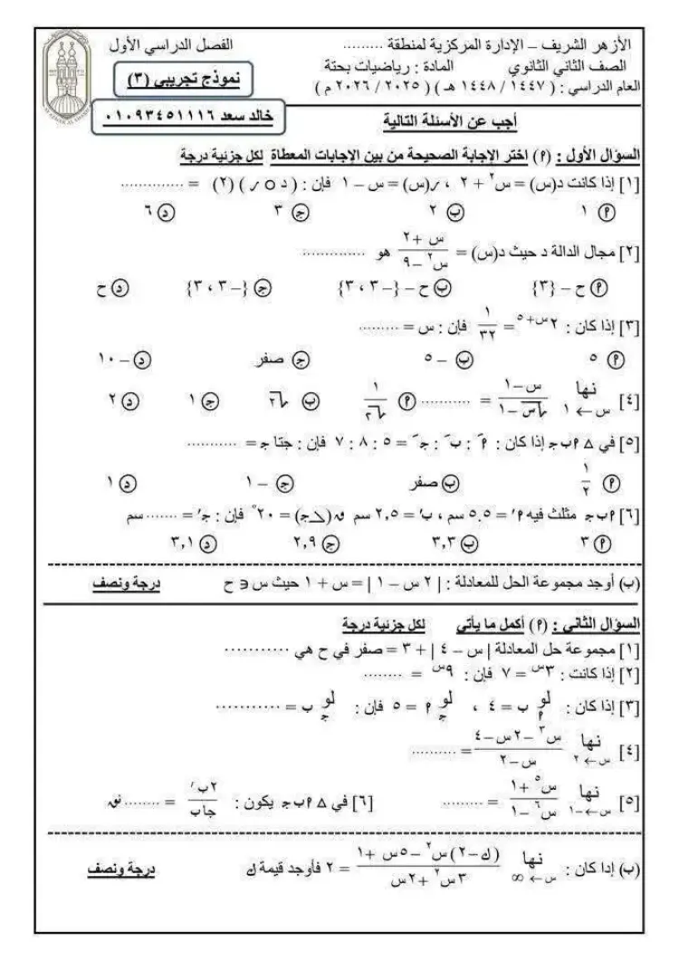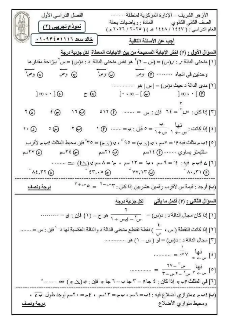 امتحانات رياضيات بحتة تانية ثانوي أزهر ترم أول 2025 2026