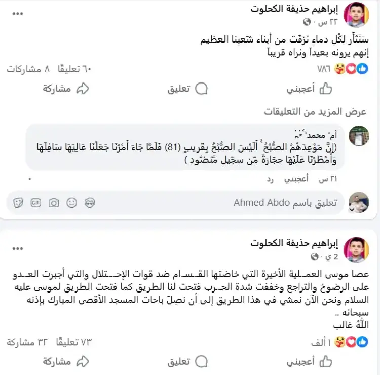 تدوينات إبراهيم الكحلوت حول الحرب في غزة