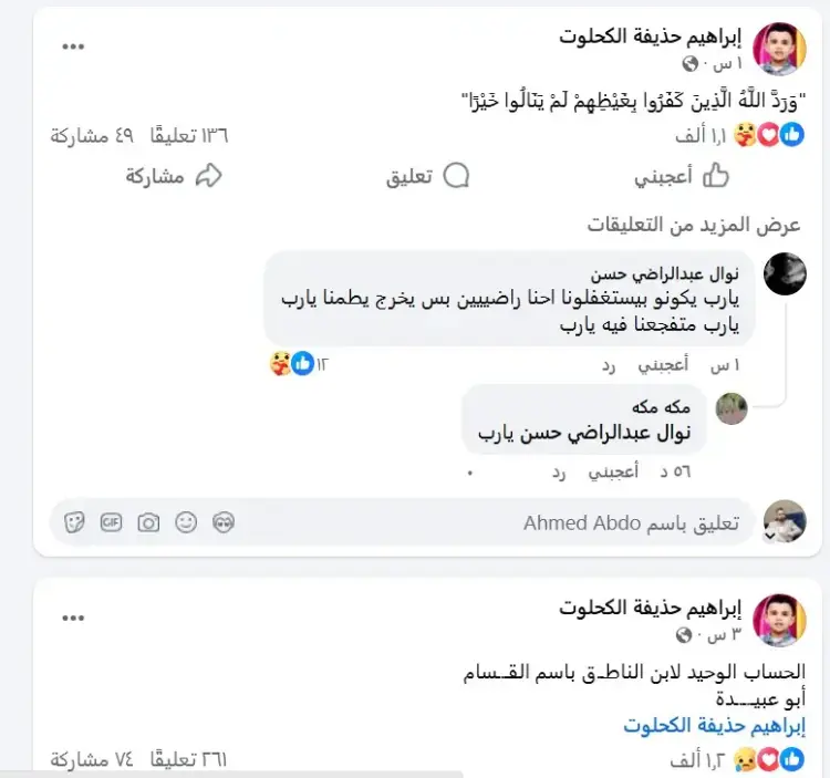 وحرص إبراهيم على التأكيد في منشور منفصل أن حسابه هو: «الحساب الوحيد لابن الناطق باسم القسام أبو عبيدة إبراهيم حذيفة الكحلوت».