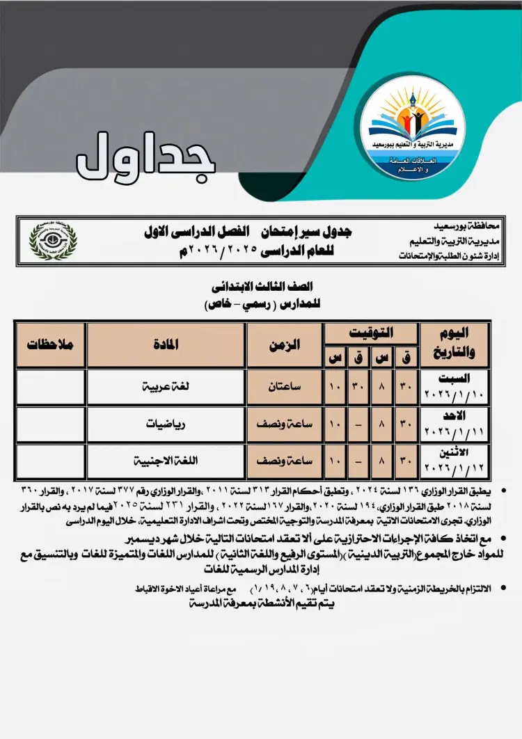 جدول امتحانات الصف الثالث الابتدائي محافظة بورسعيد الترم الأول 2026