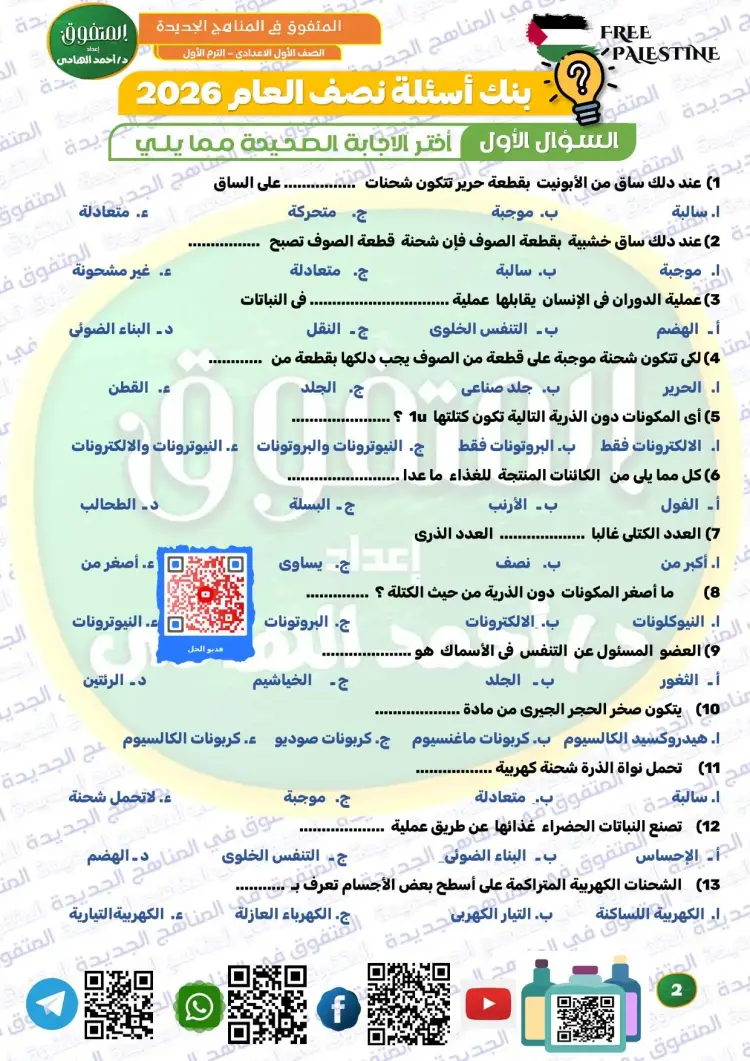 يضم ملف المتفوق علوم الصف الأول الإعدادي ترم أول 2026 مراجعة نهائية بنك أسئلة متكامل يغطي جميع أجزاء المنهج، ويشمل أنماطًا متعددة من الأسئلة المقالية والموضوعية، بما يتيح للطلاب التعرف على مختلف أشكال الأسئلة المتوقعة في الامتحان.
