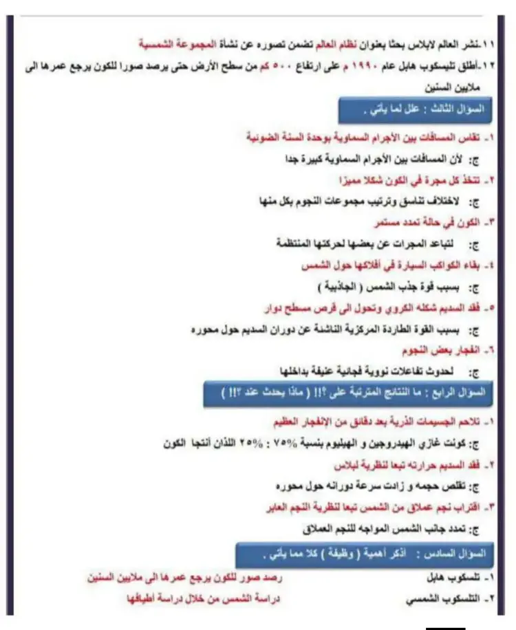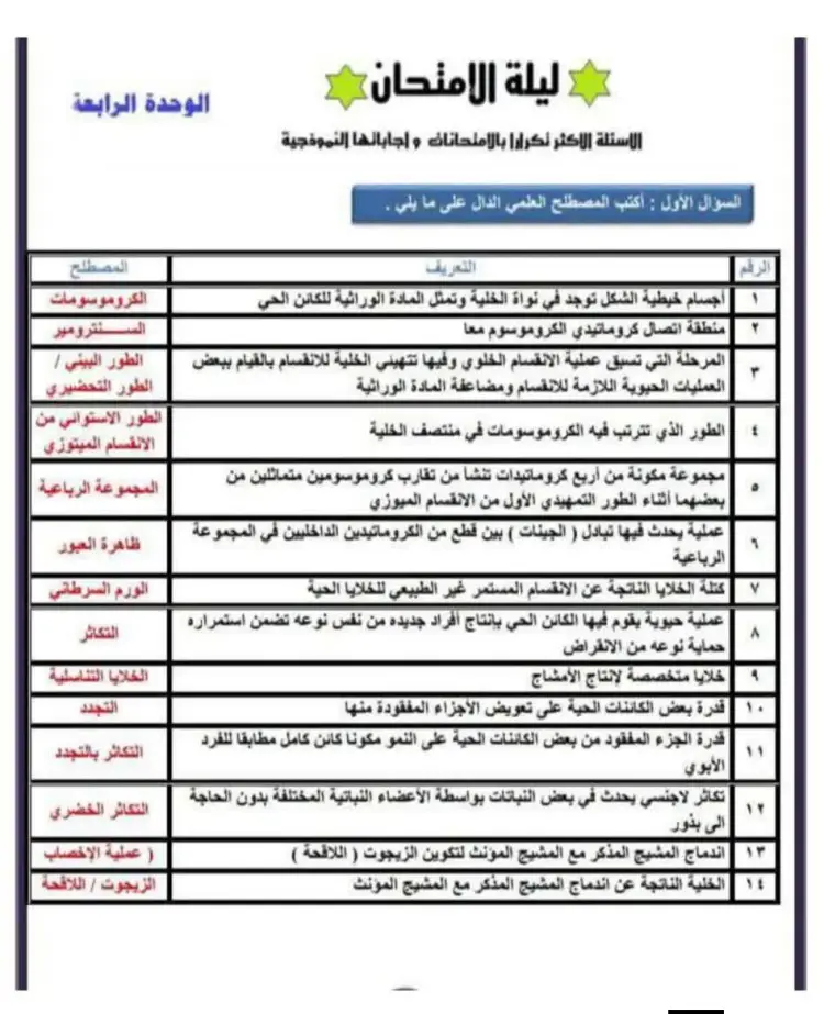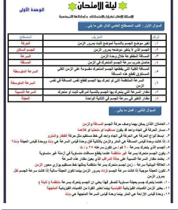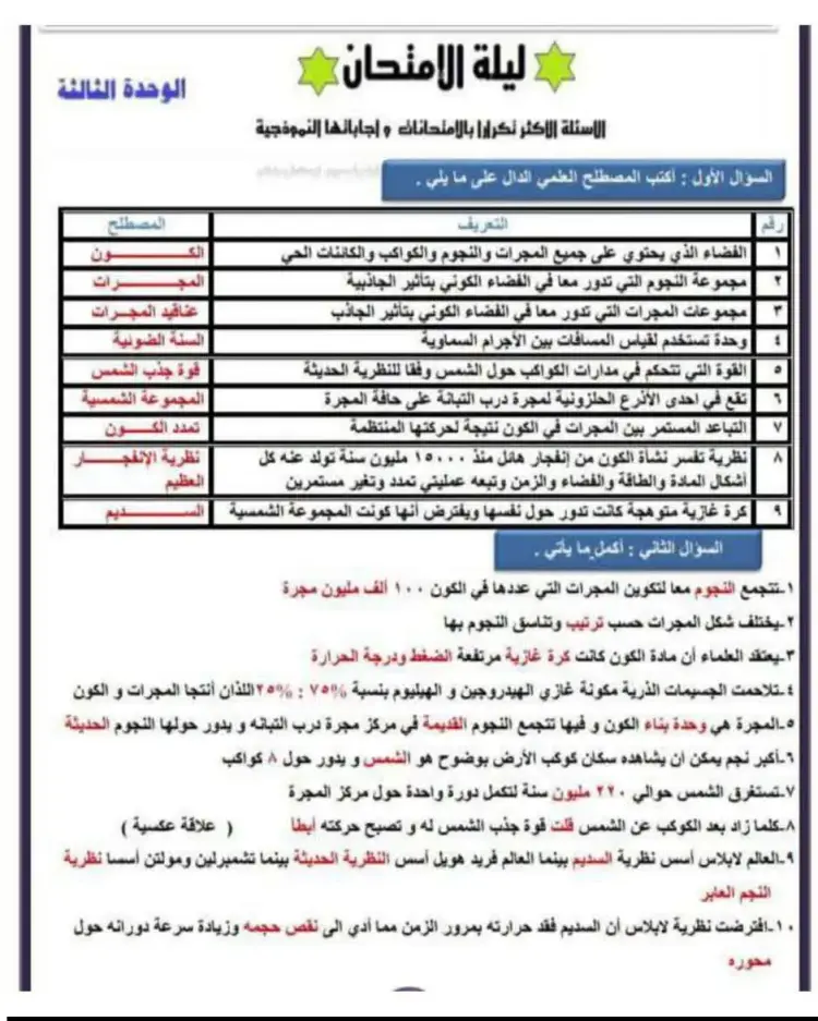 واشتملت مذكرة مراجعة ليلة الامتحان في العلوم للصف الثالث الإعدادي بالترم الأول، على شرح جميع الدروس والوحدات المقررة العديد من الأسئلة مرفق بها الإجابات، منها ما يلي: