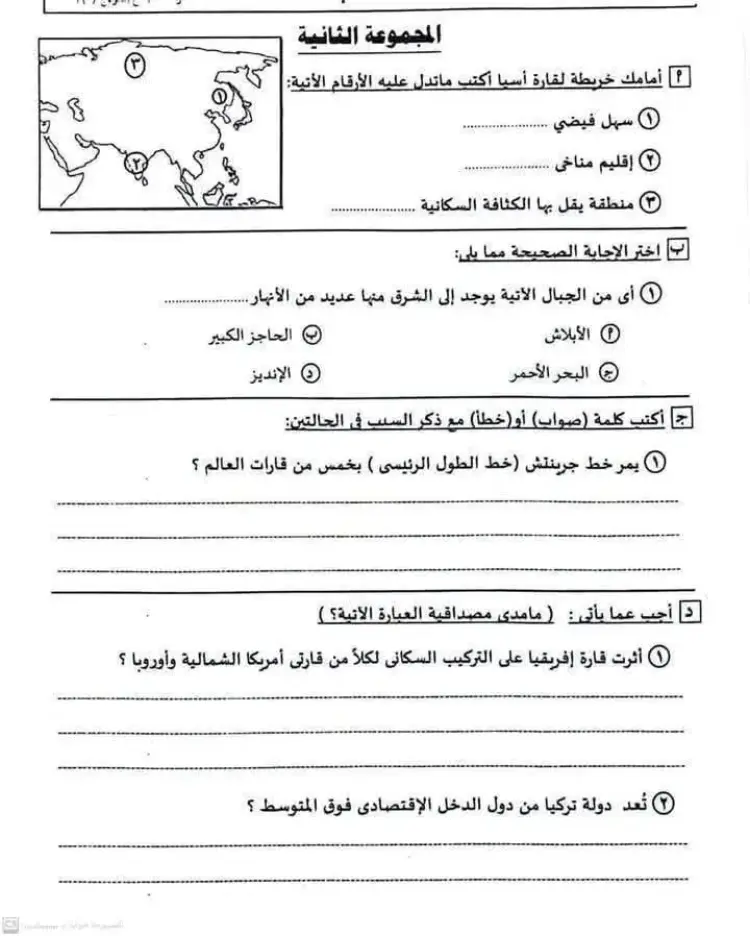 س1: أمامك خريطة لقارة آسيا، اكتب ما تدل عليه الأرقام الآتية: