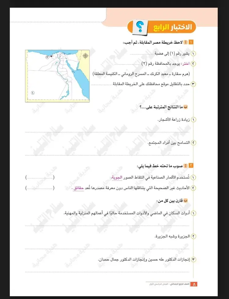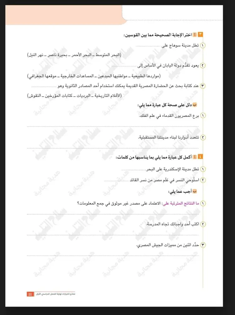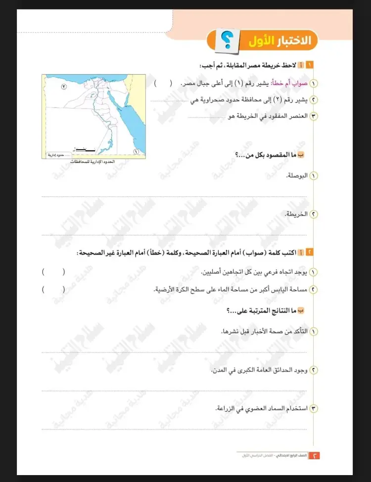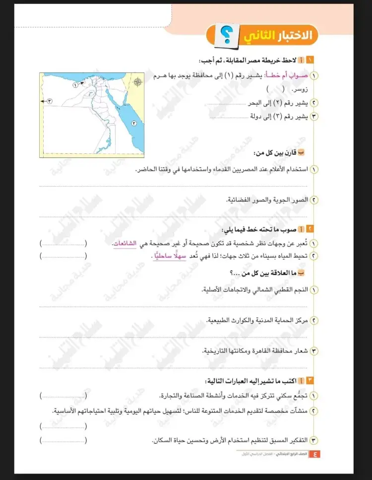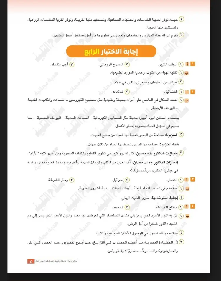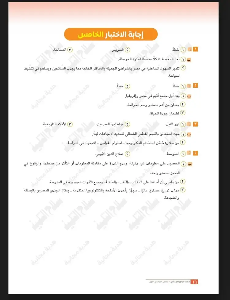 جاءت أسئلة نماذج امتحانات سلاح التلميذ رابعة ابتدائي دراسات الترم الأول 2026 بالإجابات على النحو التالي: