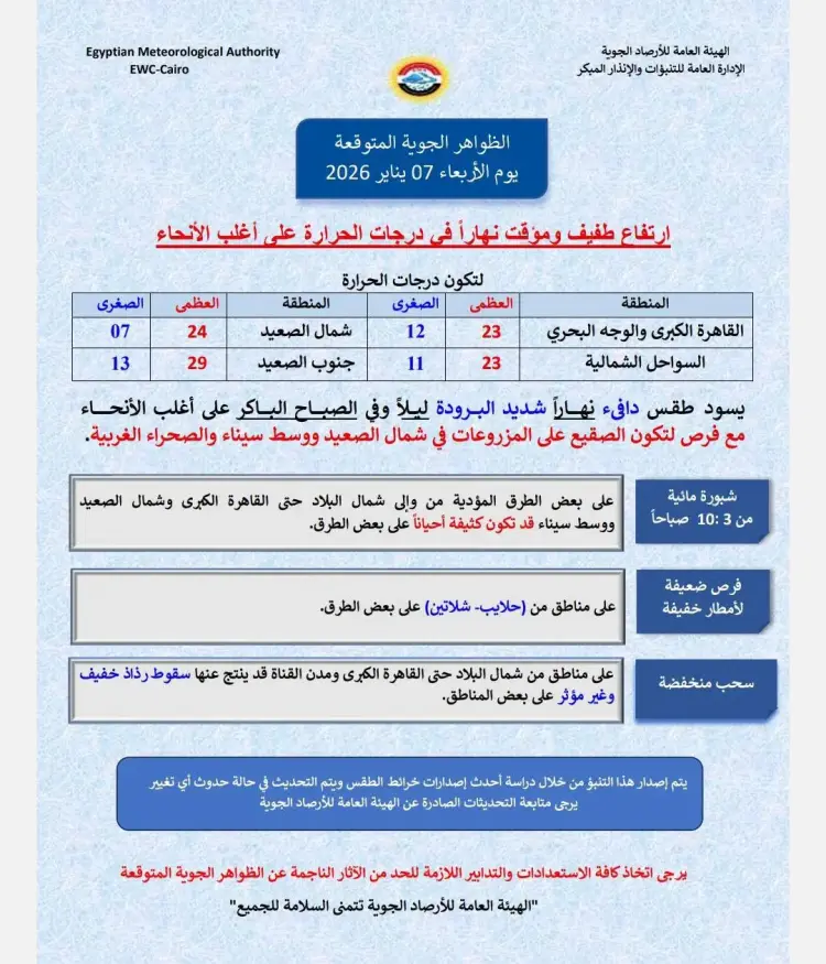 وتتكون شبورة مائية من الساعة 3 فجرا حتى 10 صباحا على بعض الطرق المؤدية من وإلى شمال البلاد حتى القاهرة الكبرى وشمال الصعيد ووسط سيناء، وقد تكون كثيفة أحيانا على بعض الطرق، فضلا عن وجود فرص ضعيفة لأمطار خفيفة على مناطق من حلايب وشلاتين.
