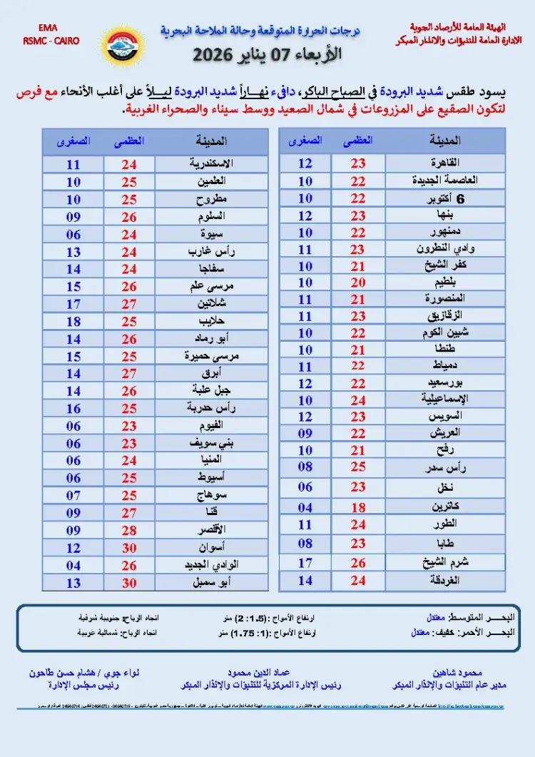 أفادت الهيئة العامة للأرصاد الجوية أن درجات الحرارة المتوقعة غدا الأربعاء كالتالي: