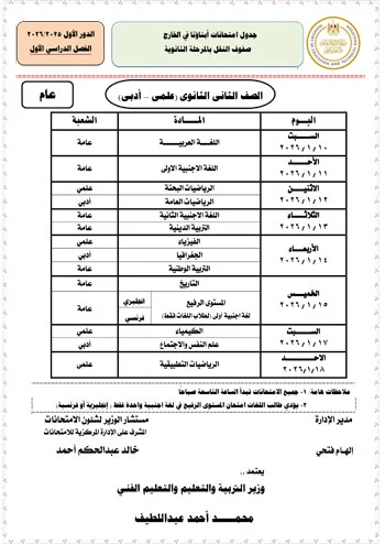 جدول امتحانات تانية ثانوي الترم الأول 2026 لأبناؤنا في الخارج