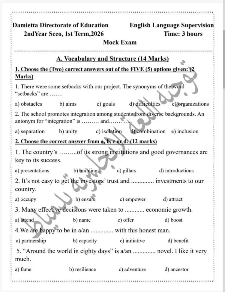 امتحان اللغة الإنجليزية الاسترشادي للصف الثاني الثانوي الفصل الدراسي الأول لمحافظة دمياط: