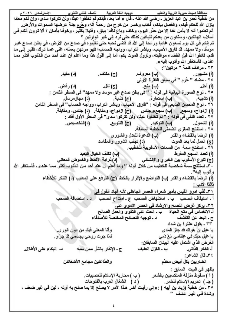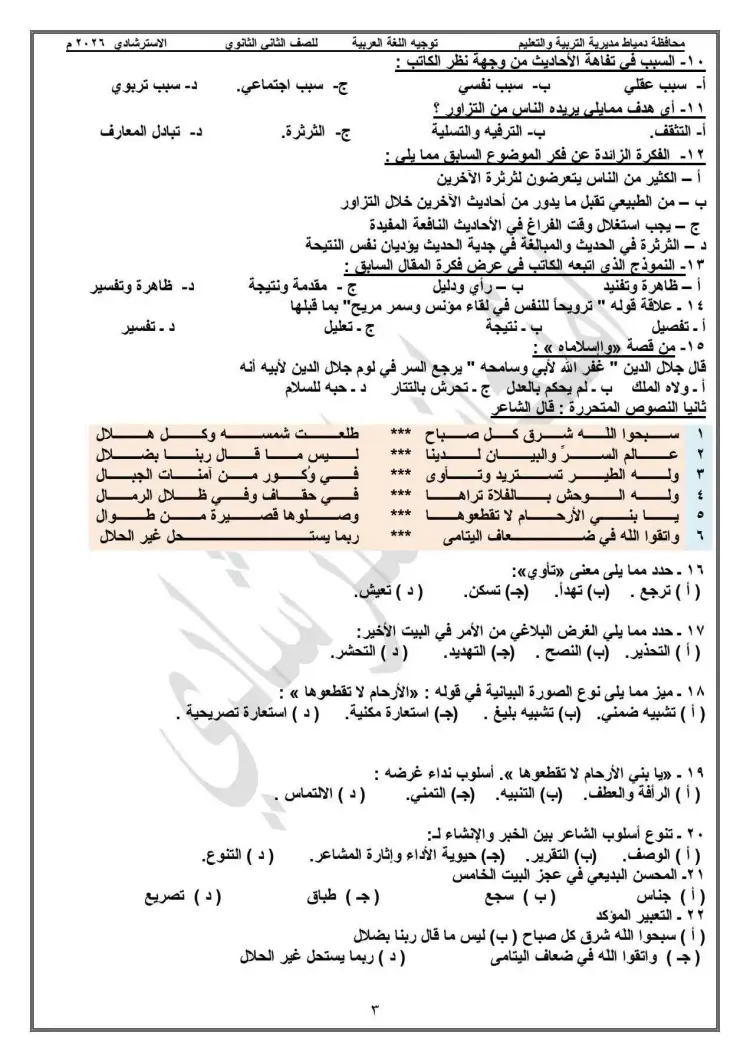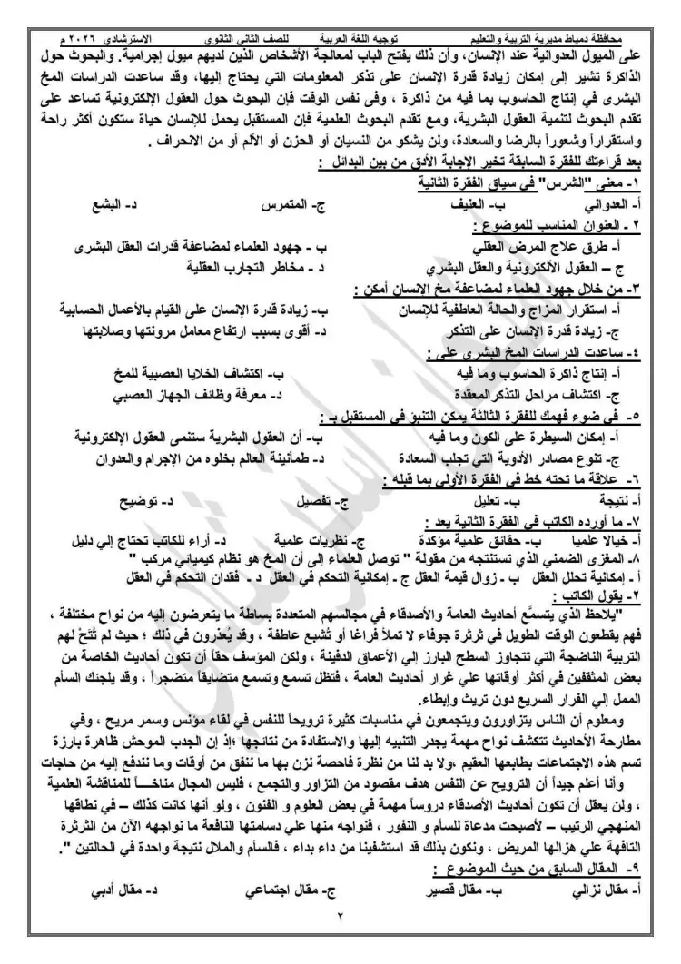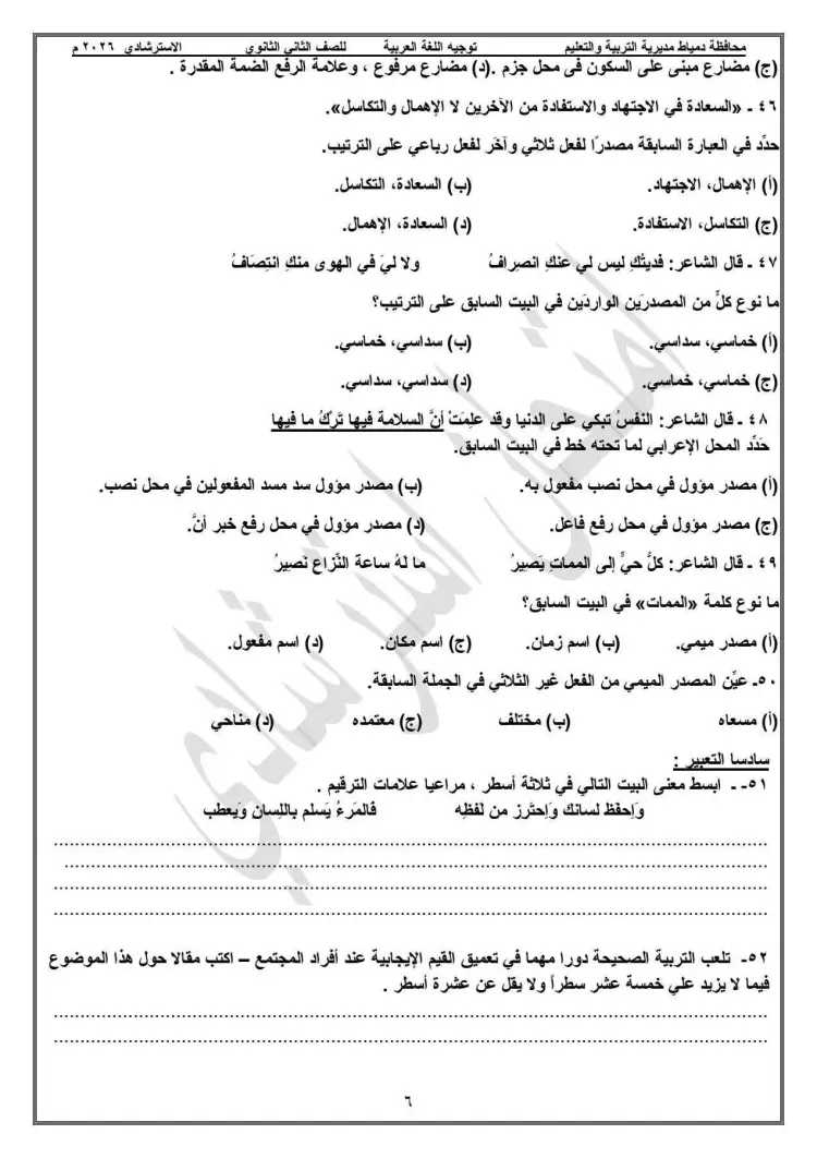 امتحان اللغة العربية الاسترشادي للصف الثاني الثانوي الفصل الدراسي الأول لمحافظة دمياط: