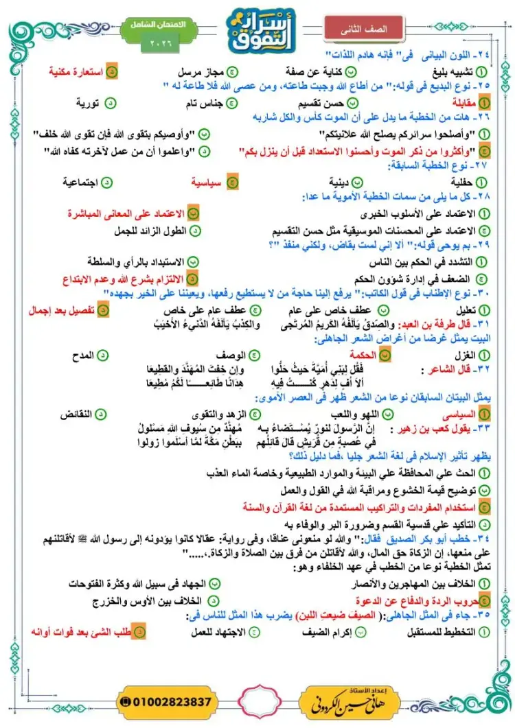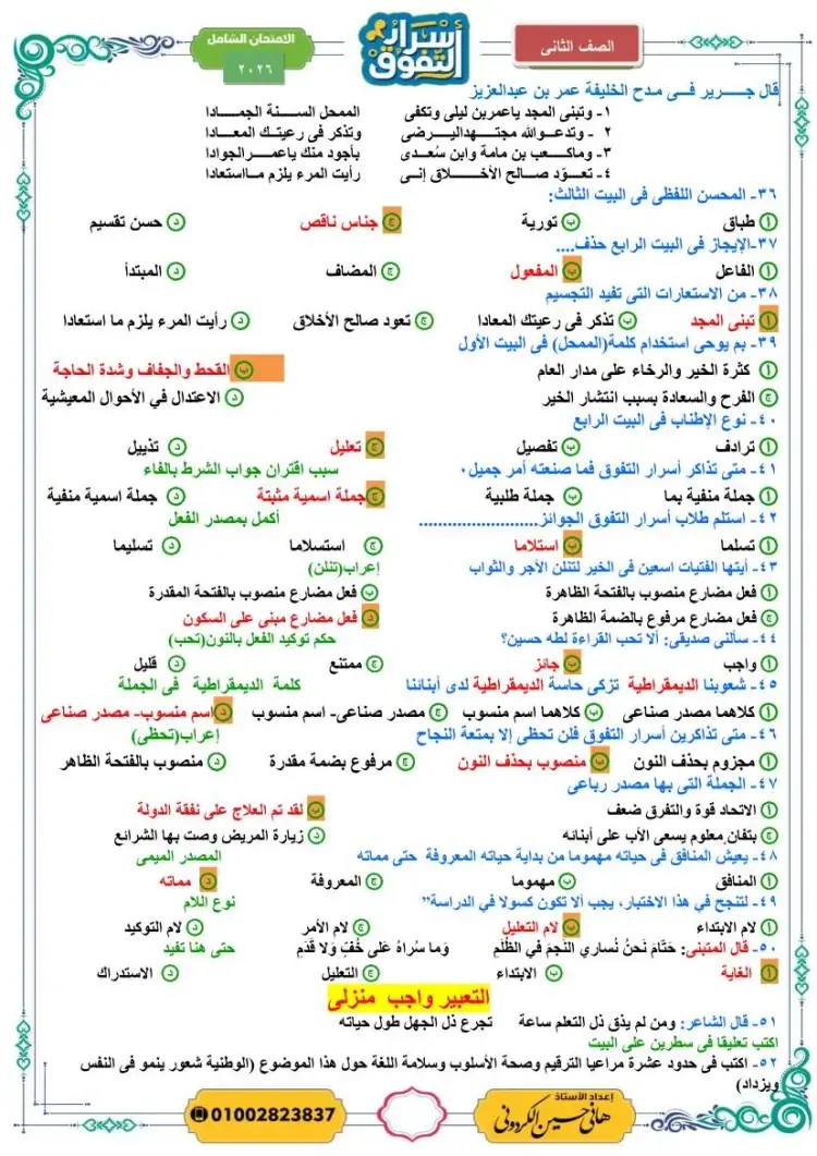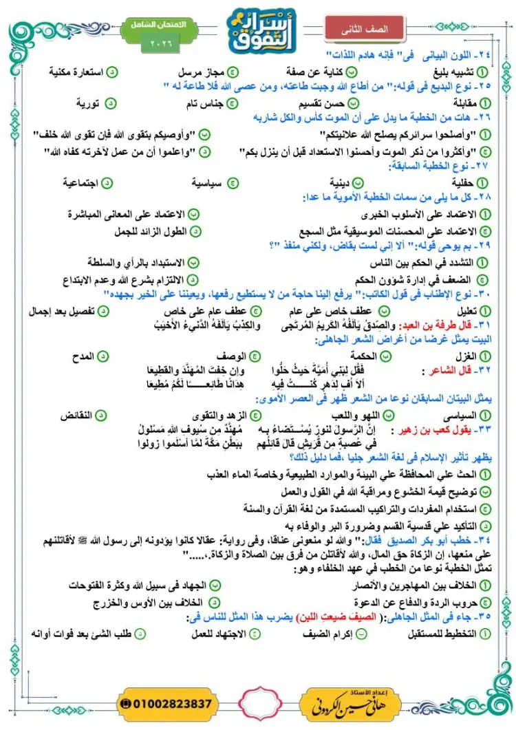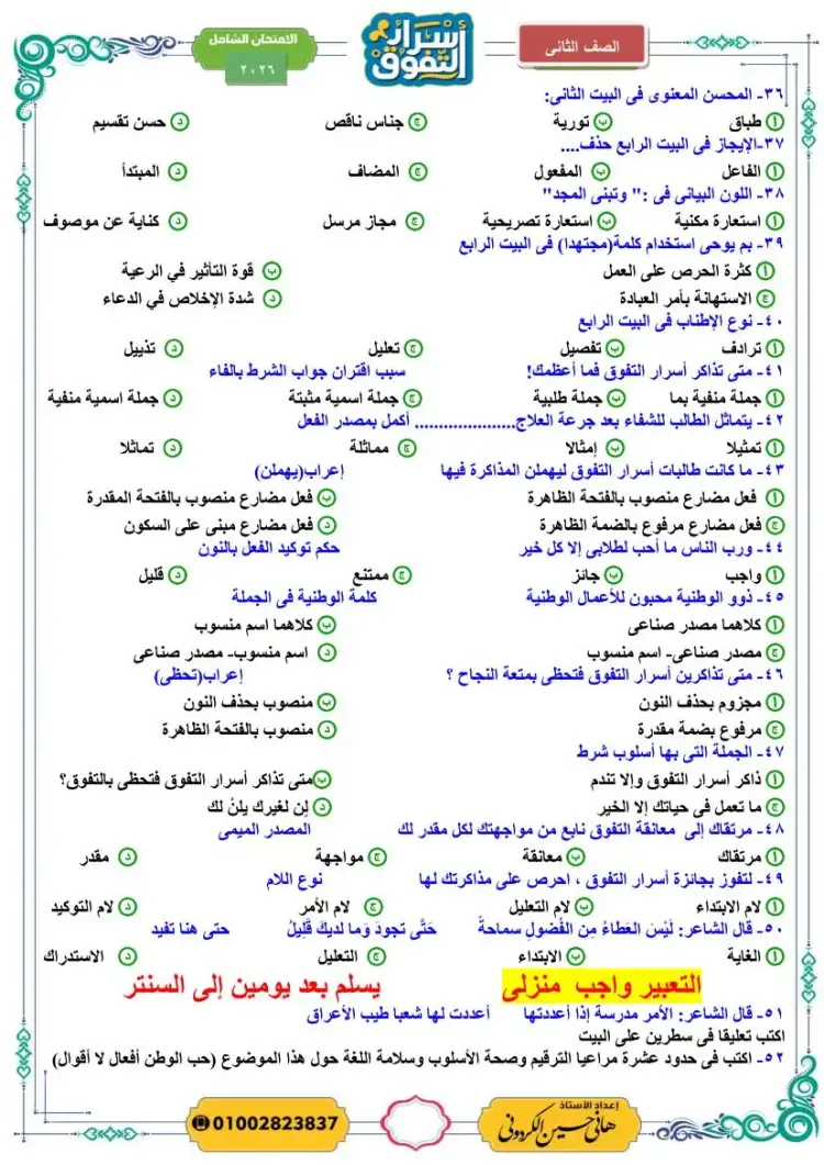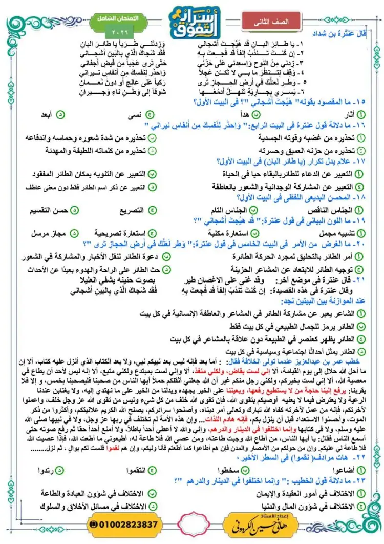 نماذج امتحانات عربي تانية ثانوي ترم أول 2026