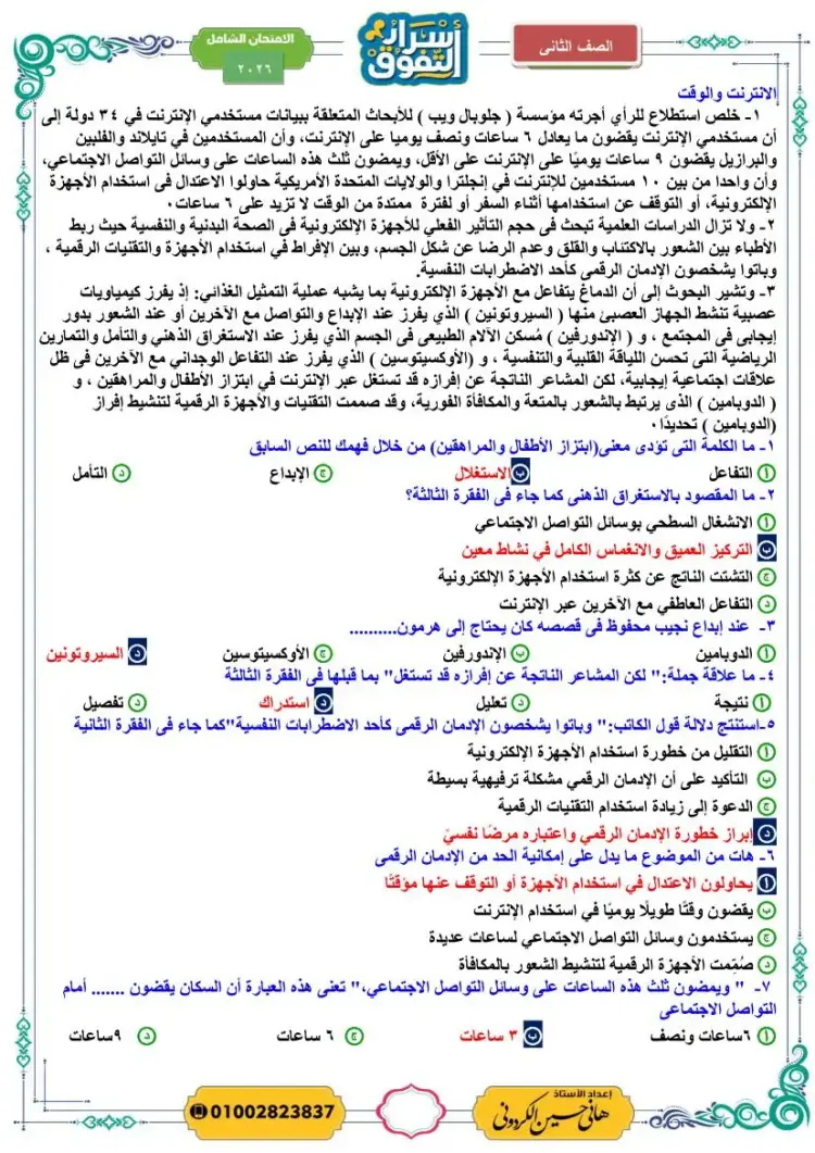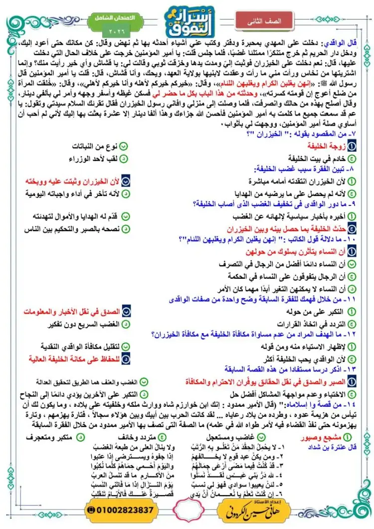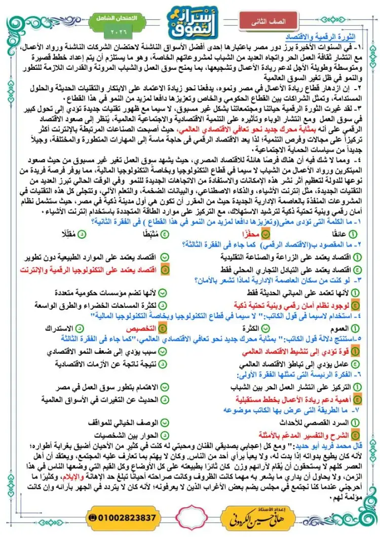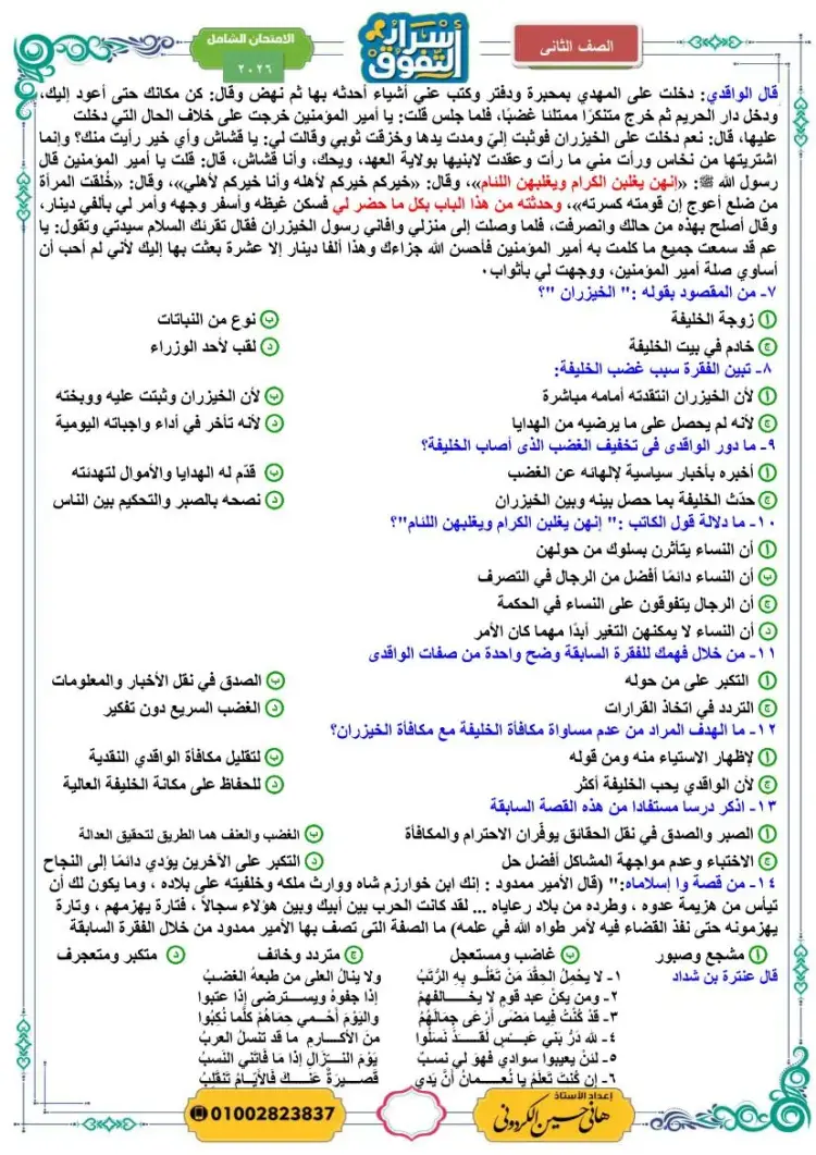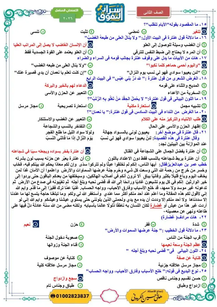 نماذج امتحانات عربي تانية ثانوي ترم أول 2026