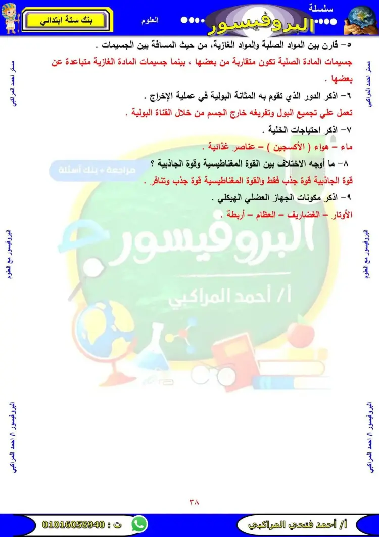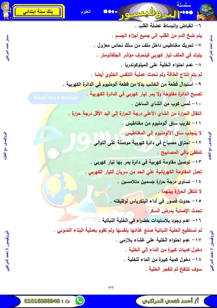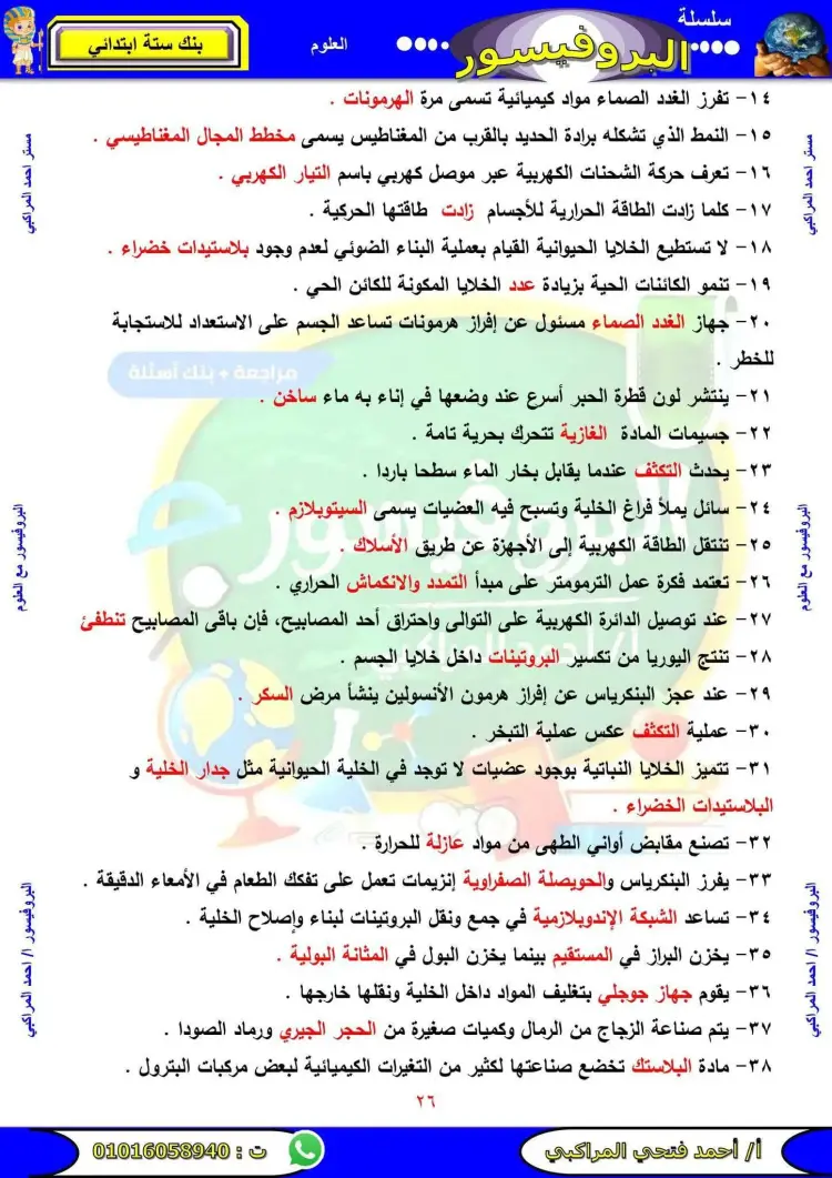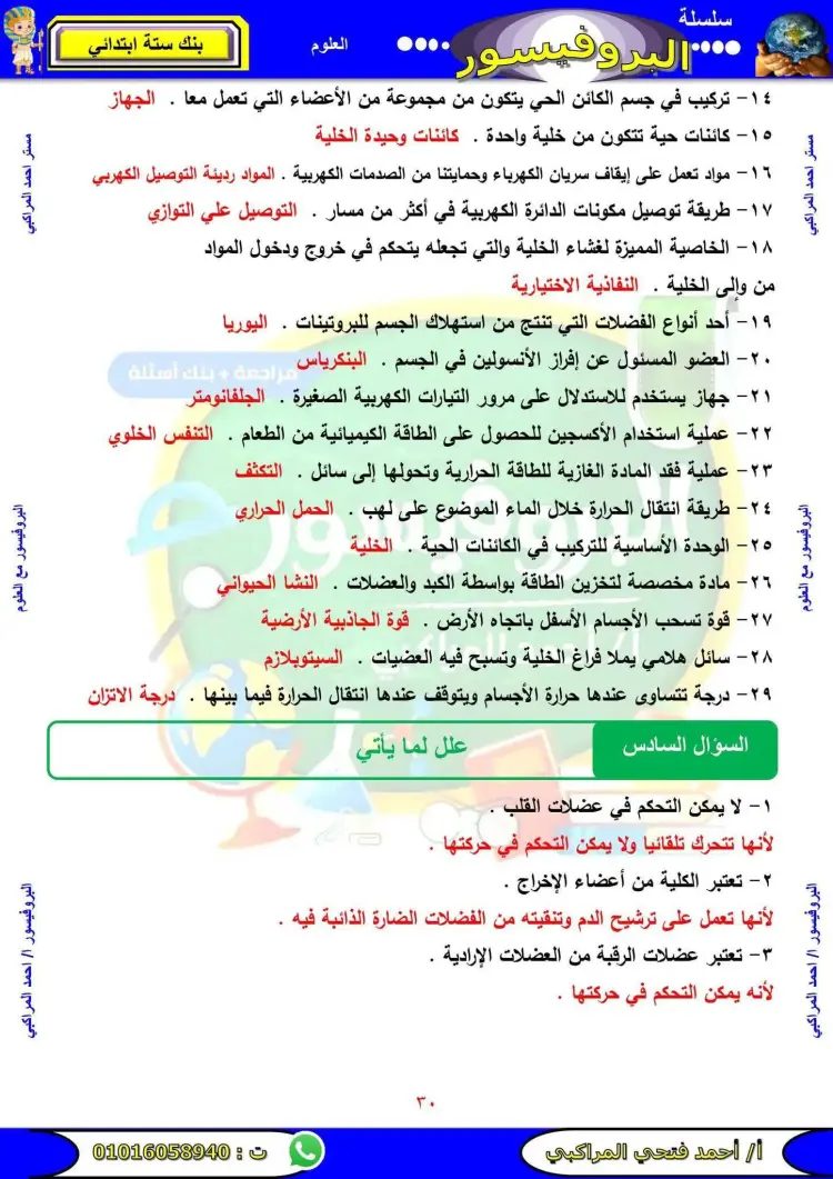 مراجعة علوم الصف السادس الابتدائي الترم الأول 2026 سؤال وجواب