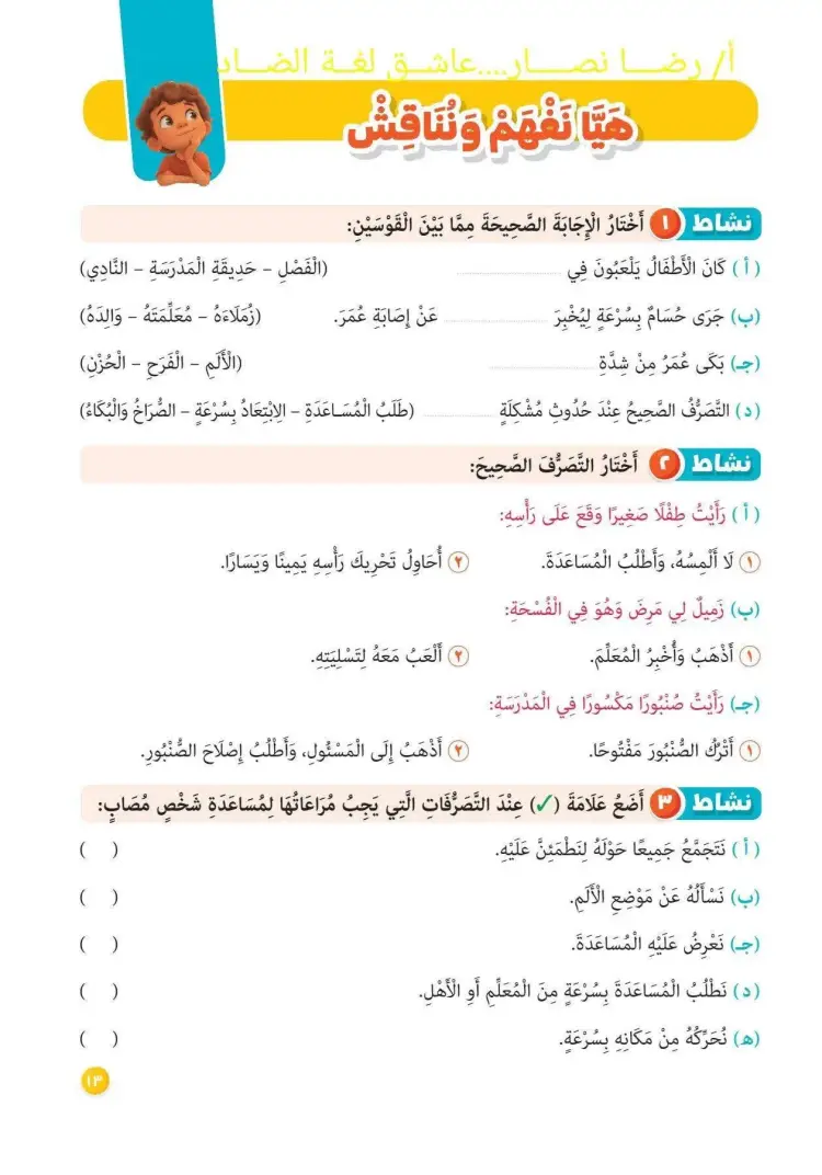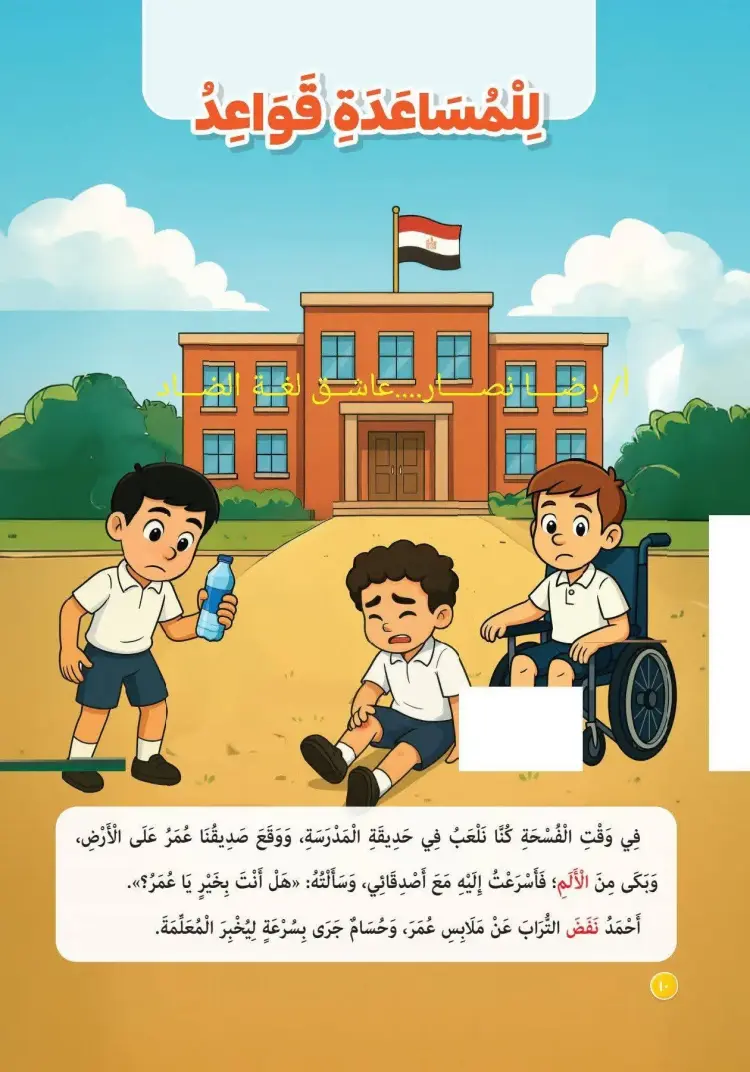 يأتي هذا الدرس، الذي جاء تحت عنوان «للمساعدة قواعد»، ليضع إطارا أخلاقيا وعمليا للتلاميذ في كيفية التصرف بمسؤولية وهدوء عند رؤية زميل مصاب، بعيدا عن العشوائية أو التسبب في ضرر إضافي.
