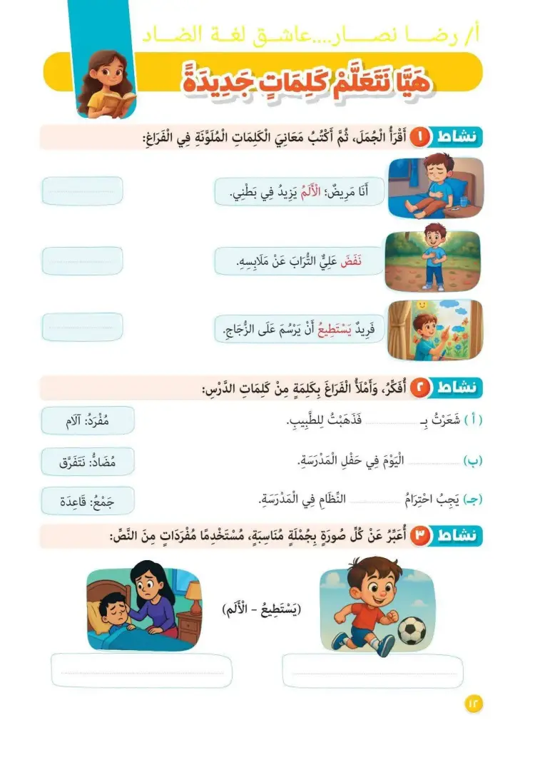 استخدم كلمة «الألم» و«تستطيع» في جمل من تعبيرك تصف بها صورة شخص مريض.