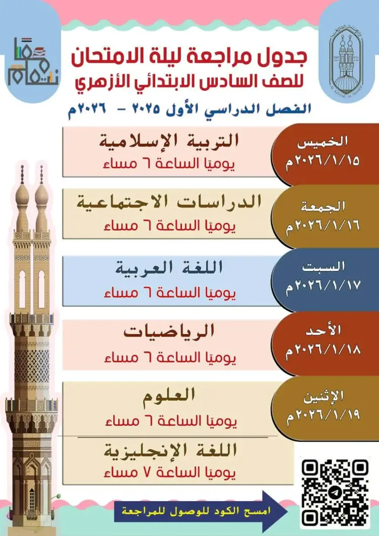 جدول مواعيد الحصص المجانية والمراجعات النهائية للشهادة الابتدائية الأزهرية 2026
