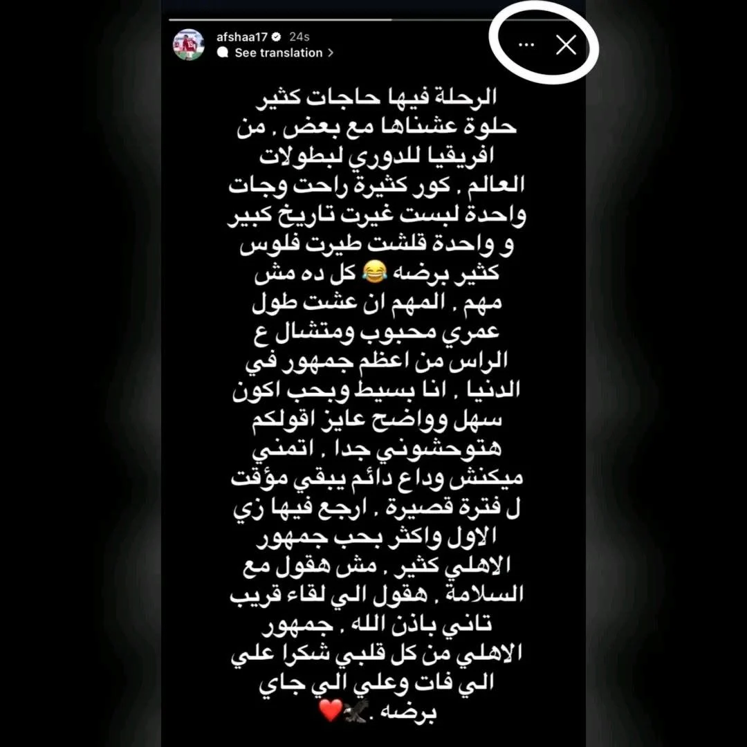 واختار محمد مجدي أفشة منصة التواصل الاجتماعي «إنستجرام» ليوجه رسالة عاطفية إلى الجماهير عبر خاصية «الستوري»، استعرض فيها ملامح رحلته مع النادي ووصفها بأنها ضمت «حاجات كثير حلوة عشناها مع بعض من أفريقيا للدوري لبطولات العالم».