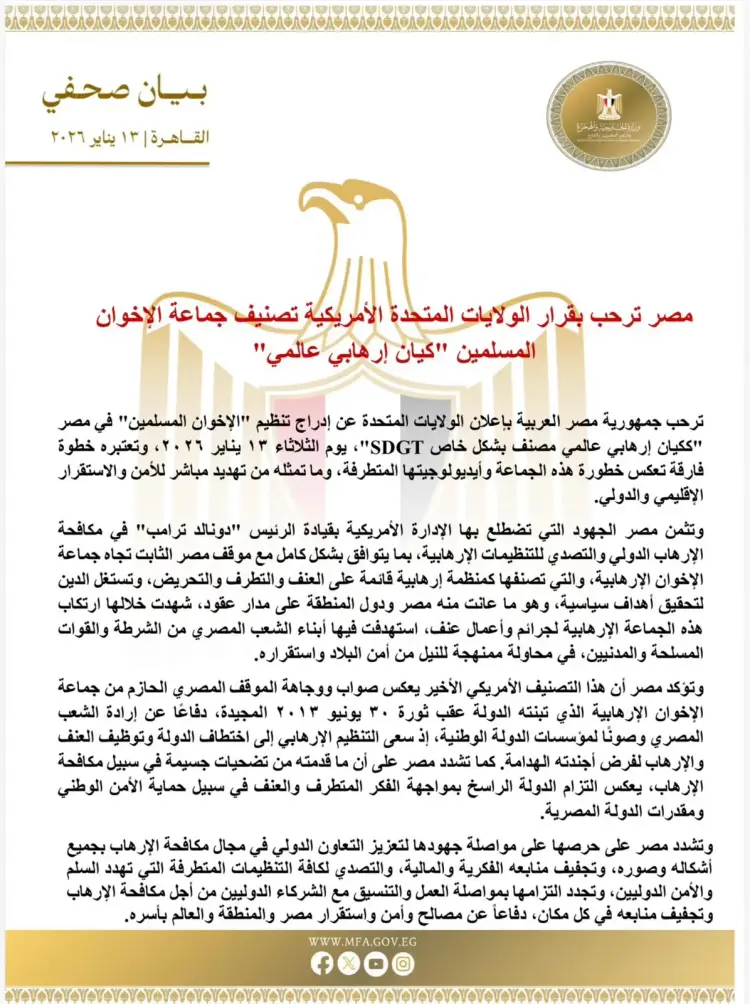 واعتبرت الخارجية أن الإجماع الدولي حول تصنيف الجماعة ككيان إرهابي هو الضمانة الأساسية لحماية المجتمعات من خطاب الكراهية والعنف الذي تتبناه الجماعة منذ عقود.