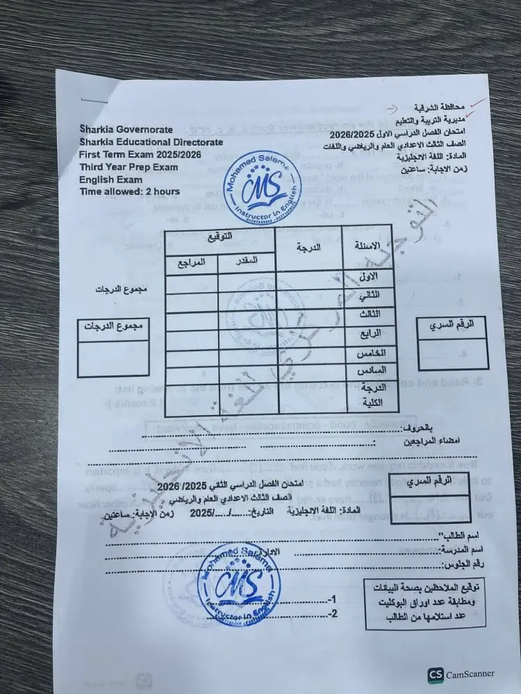 حل امتحان لغة إنجليزية للشهادة الإعدادية بالشرقية ترم أول 2026