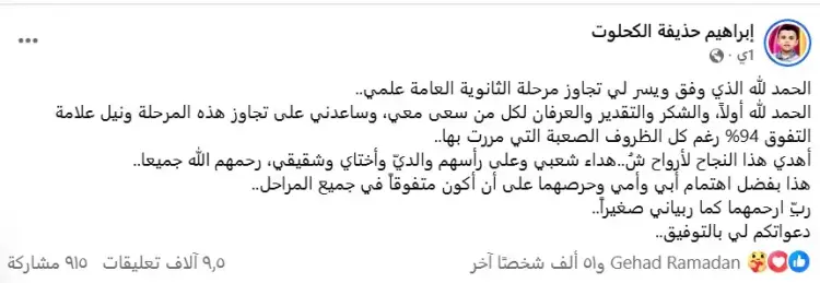 من قلب الوجع.. نجل الشهيد أبو عبيدة يكتب قصة نجاحه بمعدل 94%