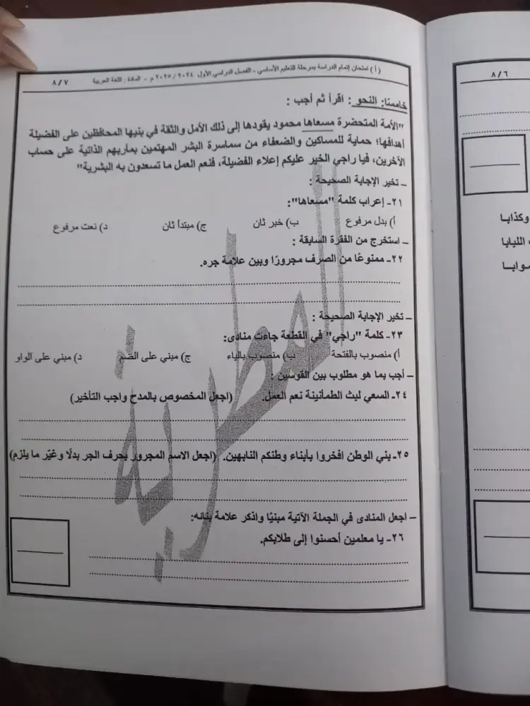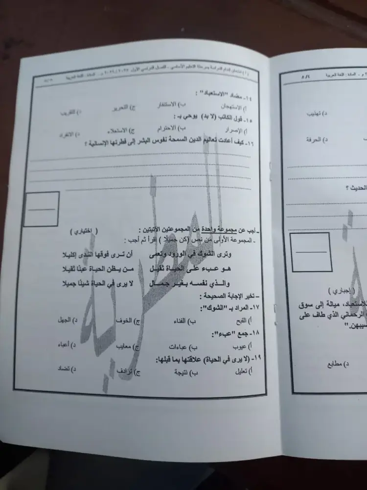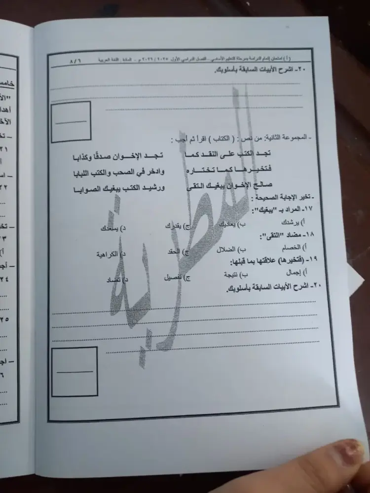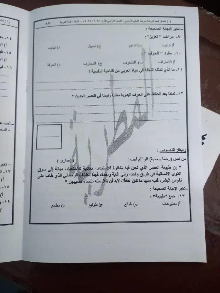 أسئلة امتحان اللغة العربية للشهادة الإعدادية الترم الأول 2026 القاهرة
