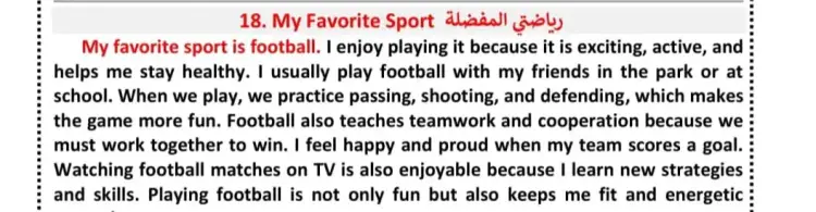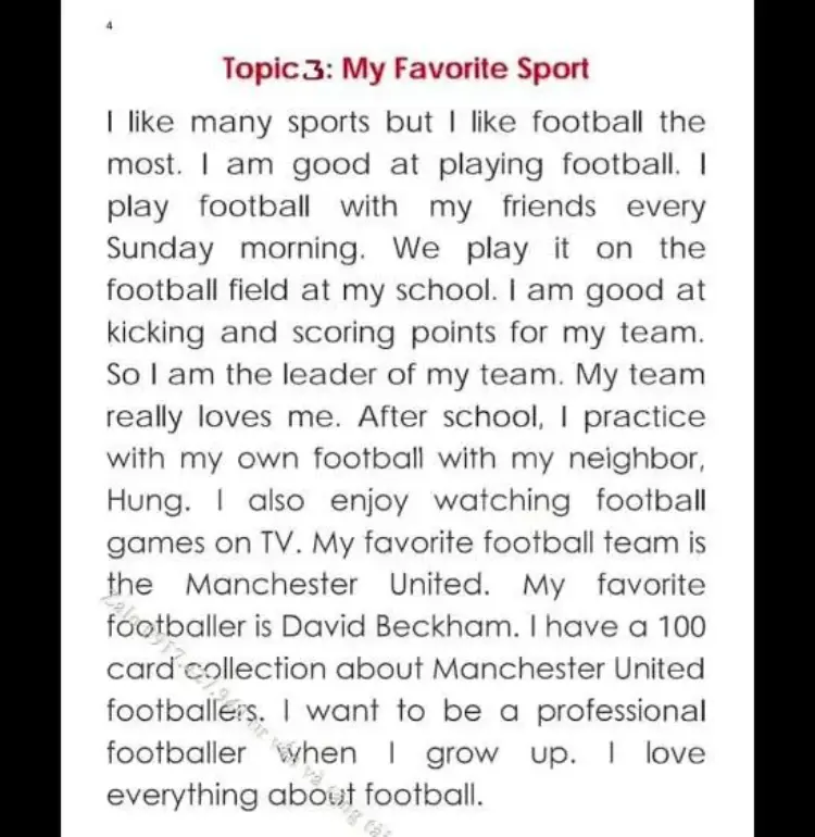 I like many sports but I like football the most. I am good at playing football. I play football with my friends every Sunday morning. We play it on the football field at my school. I am good at kicking and scoring points for my team. So I am the leader of my team. My team really loves me. After school, I practice with my own football with my neighbor, Hung. I also enjoy watching football games on TV. My favorite football team is the Manchester United. My favorite footballer is David Beckham. I have a 100 card collection about Manchester United footballers. I want to be a professional footballer when I grow up. I love everything about football.
