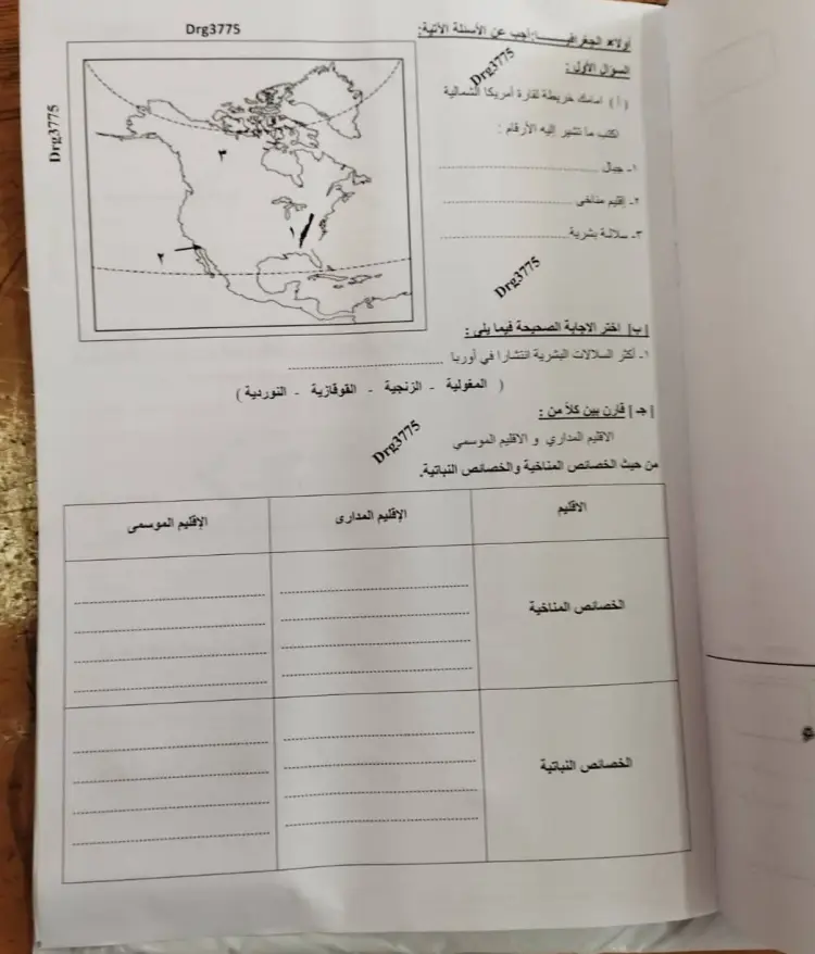 السؤال الأول: (خريطة أمريكا الشمالية)