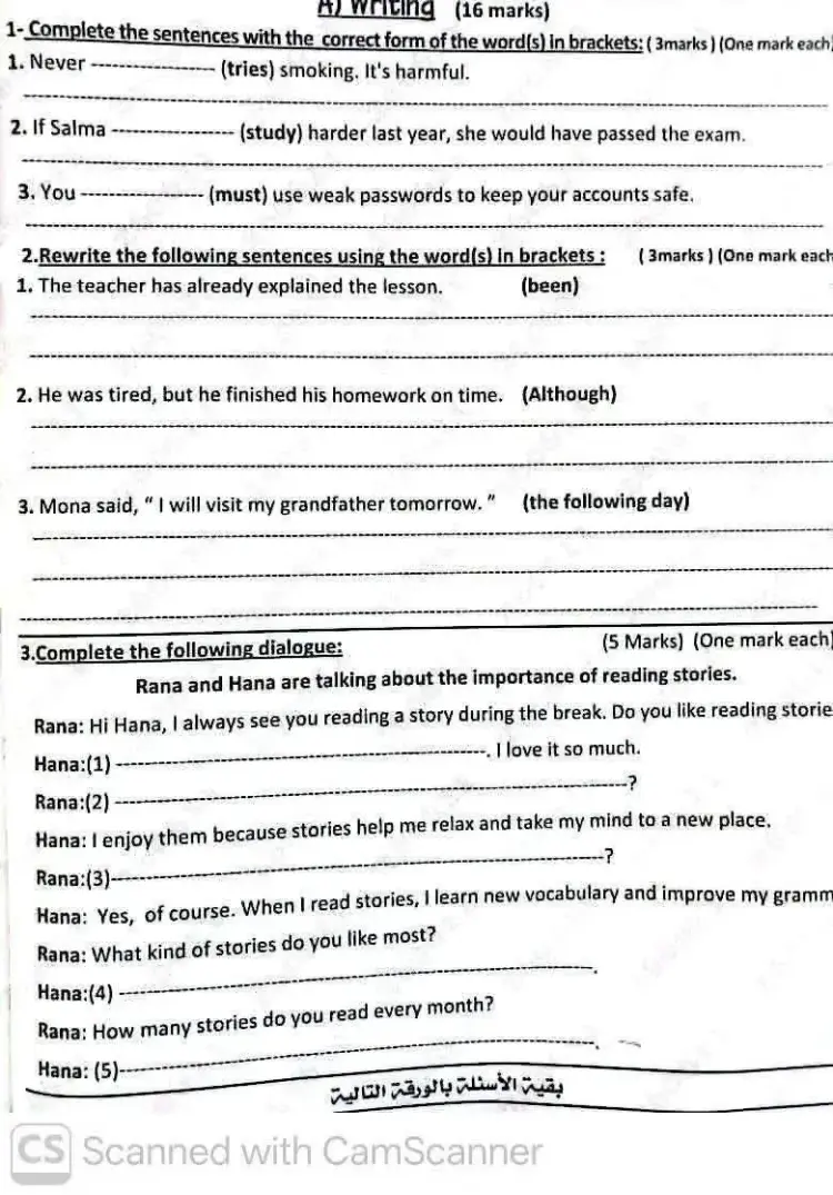 1- Never tries smoking. (الإجابة: try لأنها صيغة أمر نهي).