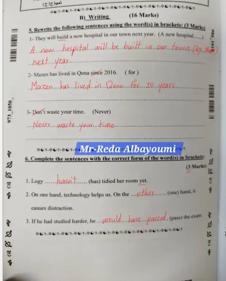 نموذج إجابة اللغة الإنجليزية للشهادة الإعدادية محافظة الغربية الترم الأول 2026