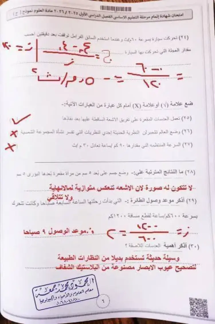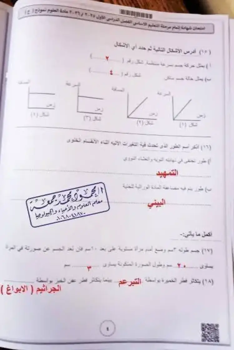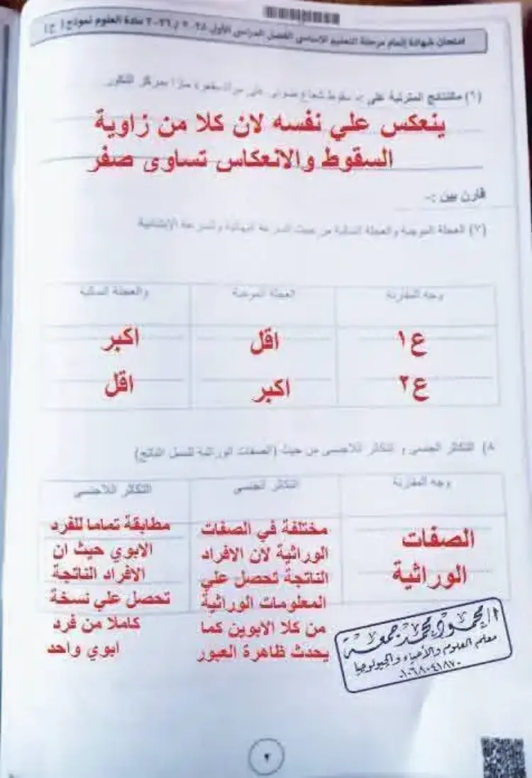 جاءت إجابات امتحان علوم للشهادة الإعدادية الترم الأول محافظة الفيوم 2026 على النحو التالي: