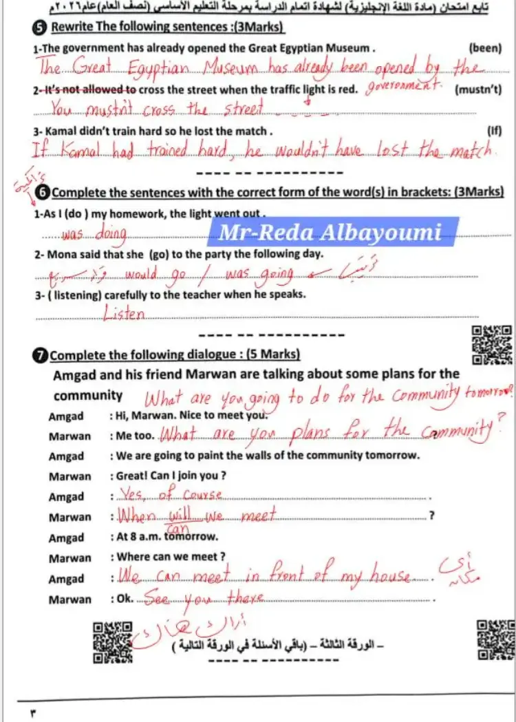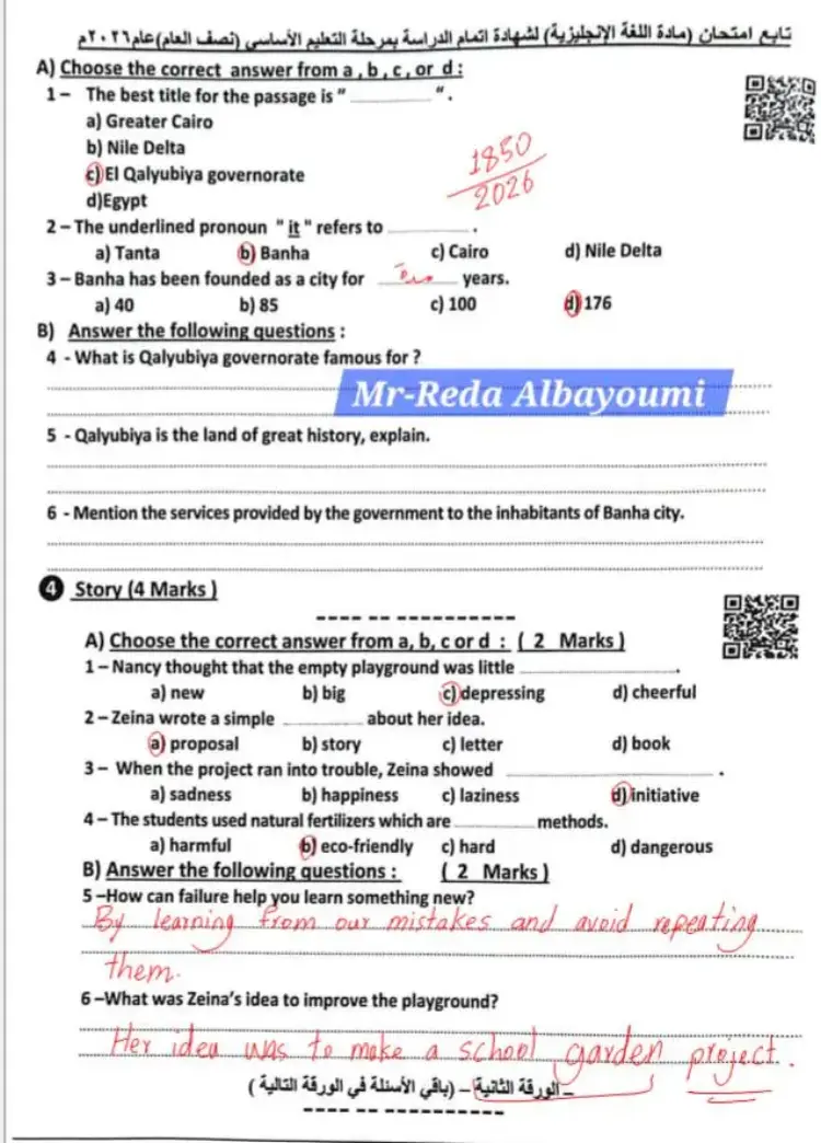 جاءت إجابات امتحان إنجليزي للشهادة الإعدادية الترم الأول 2026 محافظة القليوبية على النحو التالي: