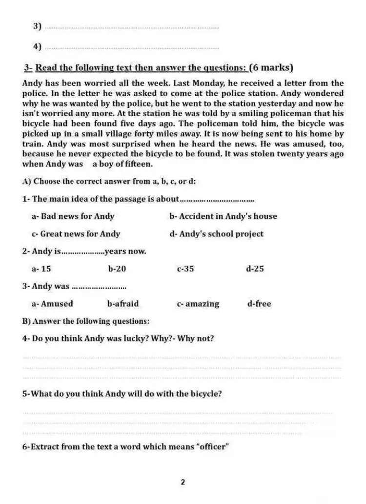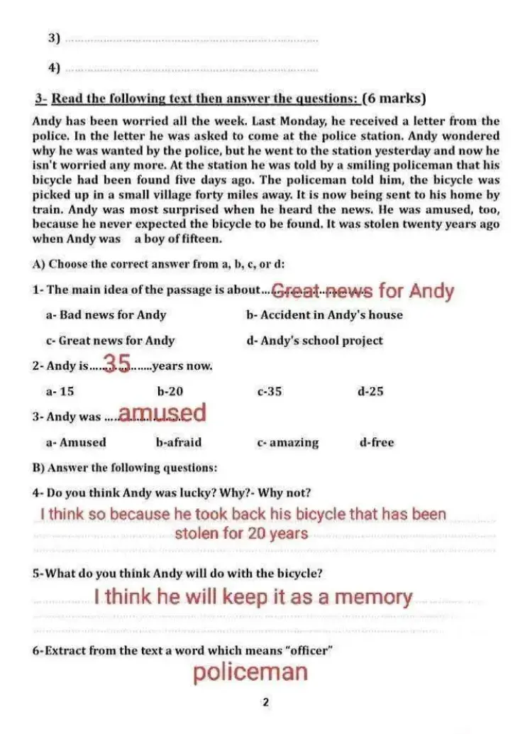 أجب عن الأسئلة التالية: 4. Do you think Andy was lucky? Why? Yes, I think so because he took back his bicycle that had been stolen for 20 years. 5. What do you think Andy will do with the bicycle? I think he will keep it as a memory. 6. Extract from the text a word which means "officer": Policeman.