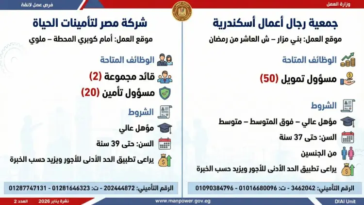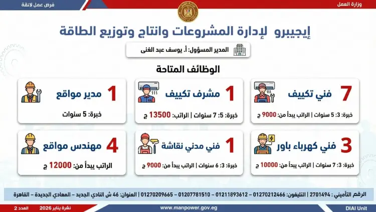 نشرة وظائف وزارة العمل يناير 2026.. توفير 6499 فرصة عمل في 10 محافظات برواتب مجزية