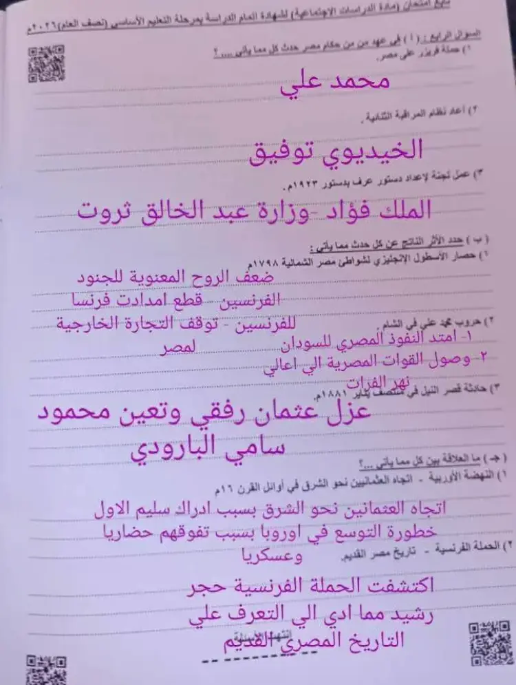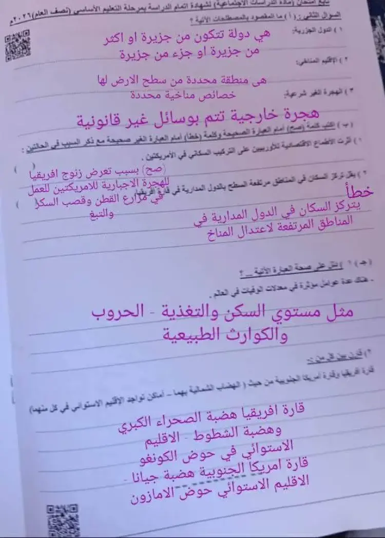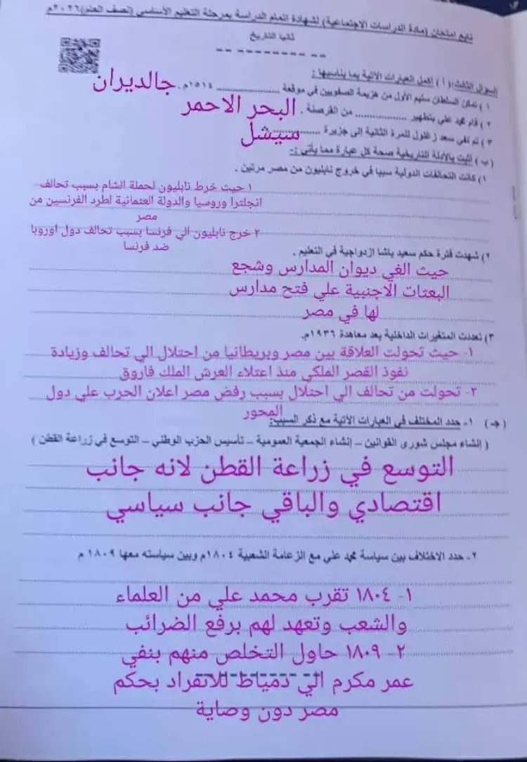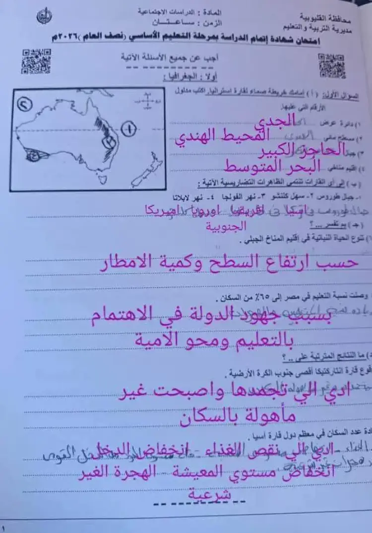 نموذج إجابة امتحان الدراسات للشهادة الإعدادية الترم الأول 2026 القليوبية