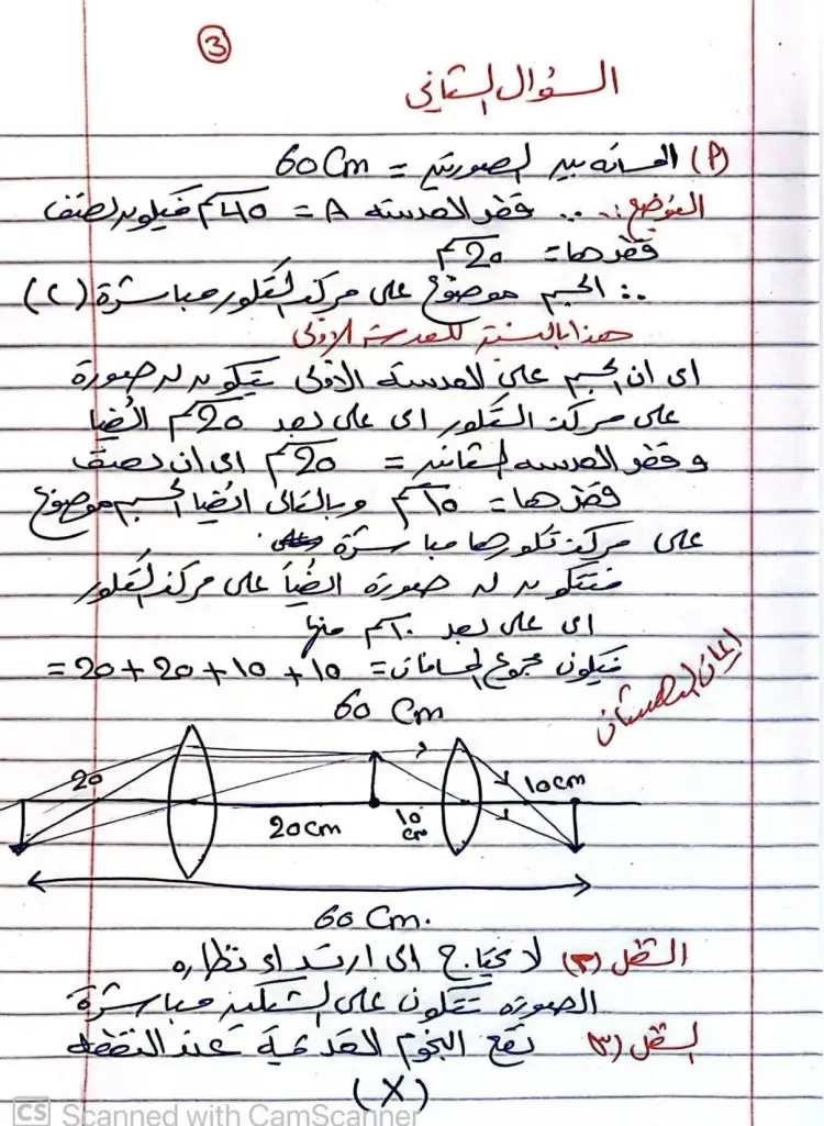 وقد اعتمد هذا الاستنتاج على تحديد قطر العدسة (أ) بـ 40 سم، مما يعني أن نصف قطرها 20 سم، وبالتالي يوضع الجسم مباشرة على مركز التكور (C) بالنسبة للعدسة الأولى، لتتكون له صورة عند مركز التكور على بعد 20 سم.