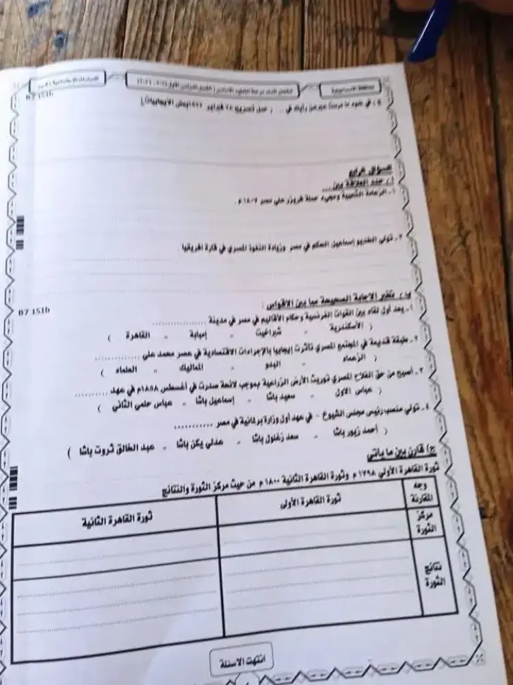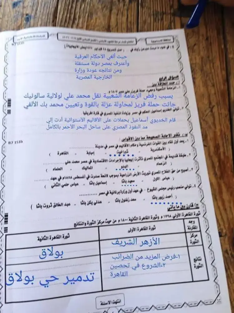 اختتم الامتحان بمقارنة تاريخية بين ثورتي القاهرة الأولى والثانية، حيث حددت الإجابات النموذجية مركز ثورة القاهرة الأولى في «الأزهر الشريف» ونتائجها التي شملت فرض الضرائب وتحصين القاهرة.