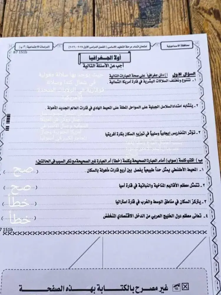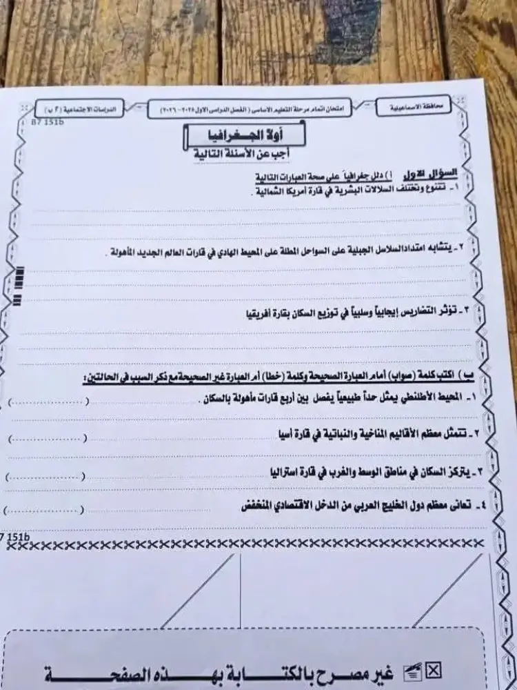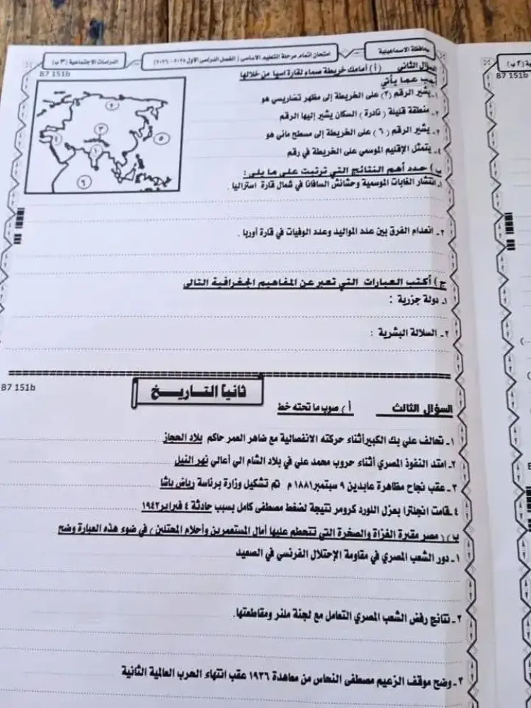 ورقة امتحان الدراسات للشهادة الإعدادية الترم الأول 2026 محافظة الاسماعيلية