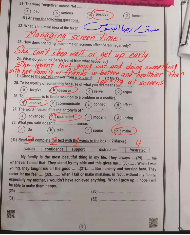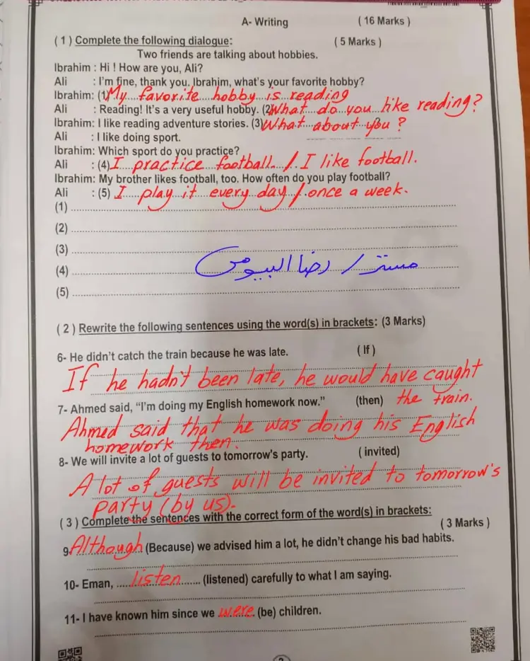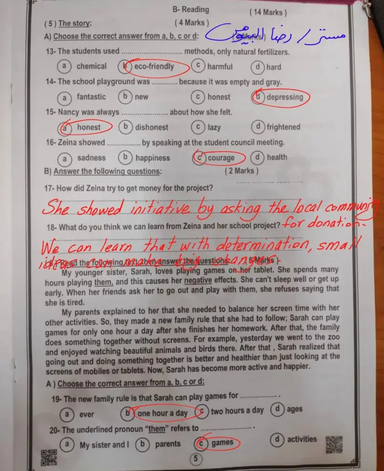 مرفق بالأسفل ورقة الامتحان بالحل، ومثال الأسئلة الواردة فيه ما يلي:
