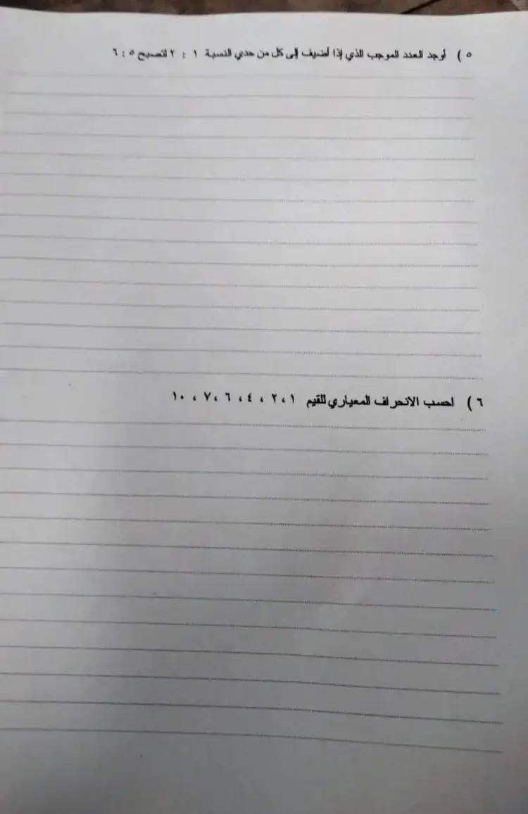 الإحصاء: تم حساب الوسط الحسابي للقيم (1, 2, 4, 6, 7, 10) وكان $\bar{x} = 5$، وتم إكمال جدول الانحراف المعياري.