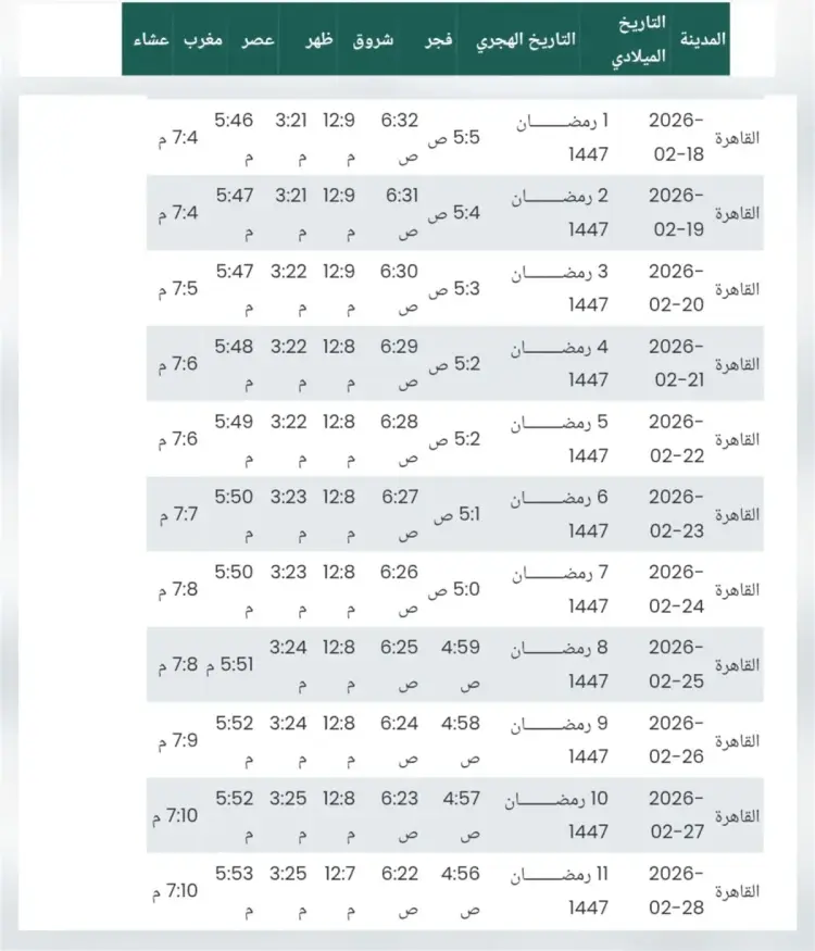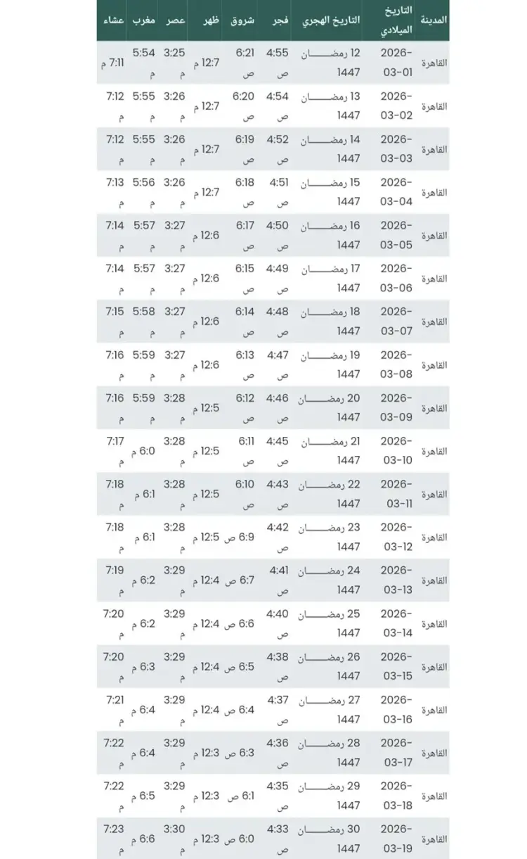 إمساكية شهر رمضان 2026 م - 1447هـ بالقاهرة