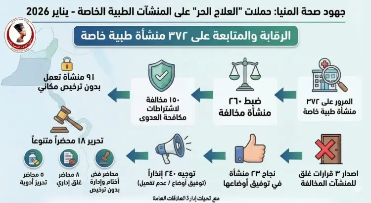 أعلنت مديرية الصحة في محافظة المنيا عن ضبط 260 منشأة طبية مخالفة وإغلاق عيادات ومعامل غير ملتزمة بالقانون خلال حملات رقابية مكثفة نفذت طوال شهر يناير 2026، في إطار جهود الدولة لضمان سلامة الخدمات الصحية المقدمة للمواطنين وتطبيق الاشتراطات الصحية الصارمة على القطاع الخاص.
