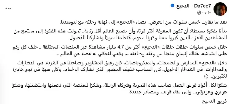 واختتم الفريق بيانه بتوجيه الشكر للمنصة الداعمة وللمشاهدين الذين تشاركوا الفضول المعرفي طوال السنوات الماضية، مع الإشارة إلى «لقاء قريب» يلمح إلى إمكانية ظهور المحتوى في ثوب جديد أو عبر مظلة إنتاجية مختلفة، دون الكشف عن الوجهة القادمة بشكل محدد حتى الآن.