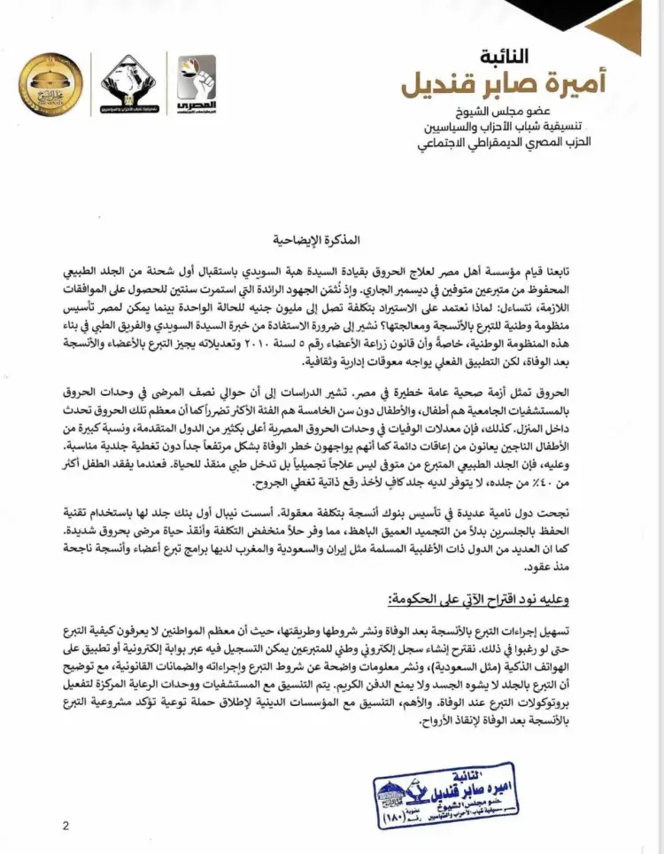 استندت النائبة في مقترحها الموجه إلى وزير الصحة والسكان ورئيس مجلس الشيوخ إلى المادة 133 من الدستور والمادة 113 من اللائحة الداخلية للمجلس، مؤكدة أن الهدف الأساسي هو إنقاذ حياة مصابي الحروق الذين يواجهون خطر الوفاة أو الإعاقة الدائمة.