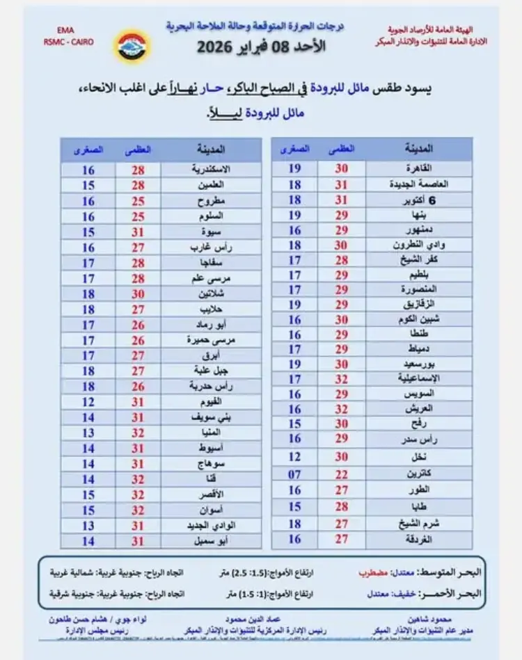 توقعت الهيئة العامة للأرصاد الجوية أن تسود أحوال جوية غير معتادة لغالبية أنحاء جمهورية مصر العربية غدًا الأحد 8 فبراير 2026، حيث يتوقع ارتفاع ملحوظ في درجات الحرارة نهارا مع أجواء حارة على أغلب المناطق رغم أننا في فصل الشتاء، وهو ما دفع الهيئة إلى إطلاق تحذيرات للمواطنين بعدم المكوث لفترات طويلة تحت أشعة الشمس خلال ساعات الذروة.