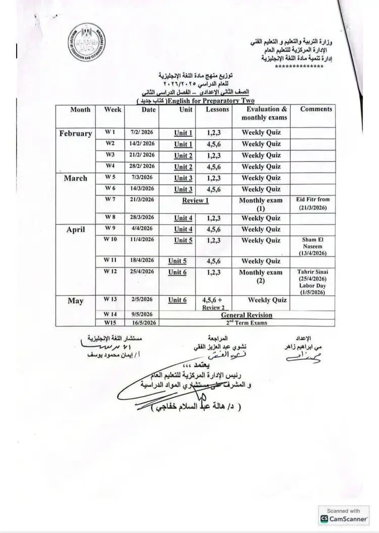 توزيع منهج اللغة الإنجليزية تانية إعدادي الترم الثاني 2026
