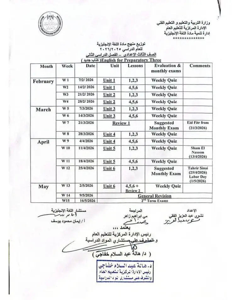 توزيع منهج الإنجليزي الصف الثالث الإعدادي الترم الثاني 2026