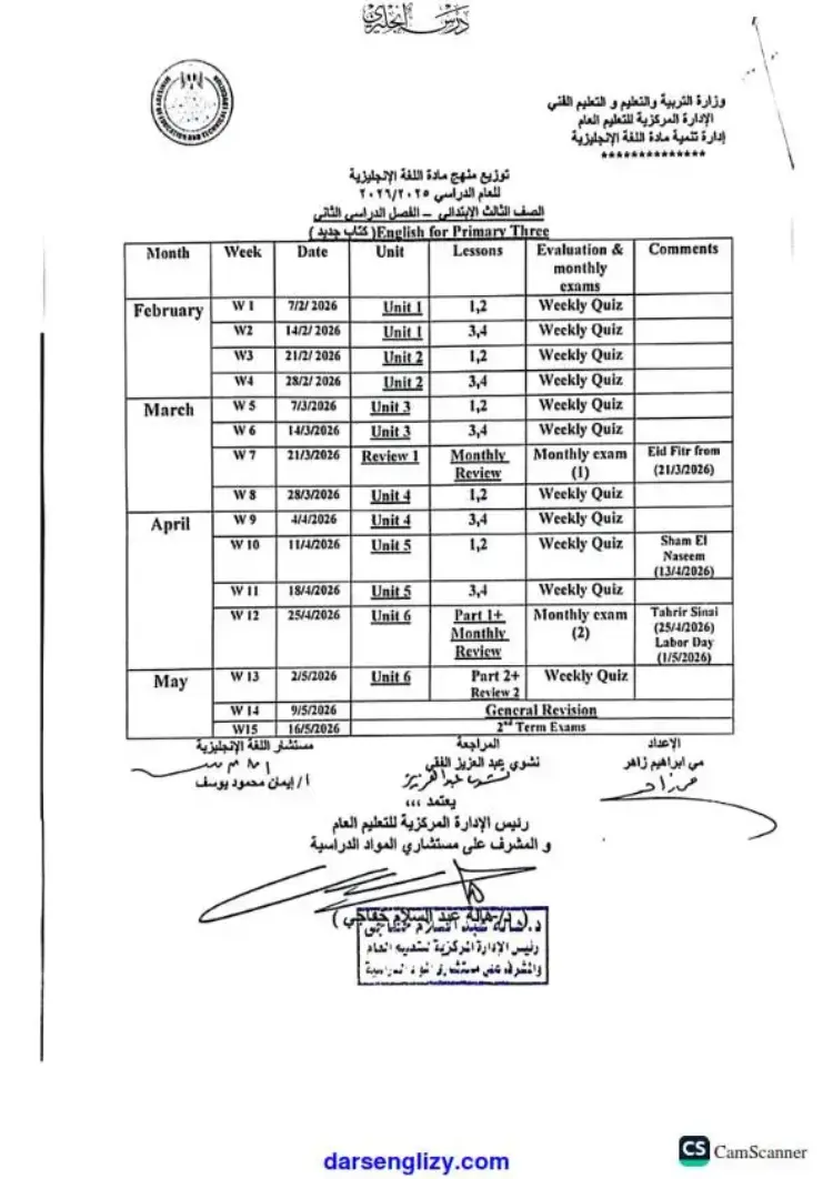 توزيع منهج الإنجليزي تالتة ابتدائي الترم الثاني 2026