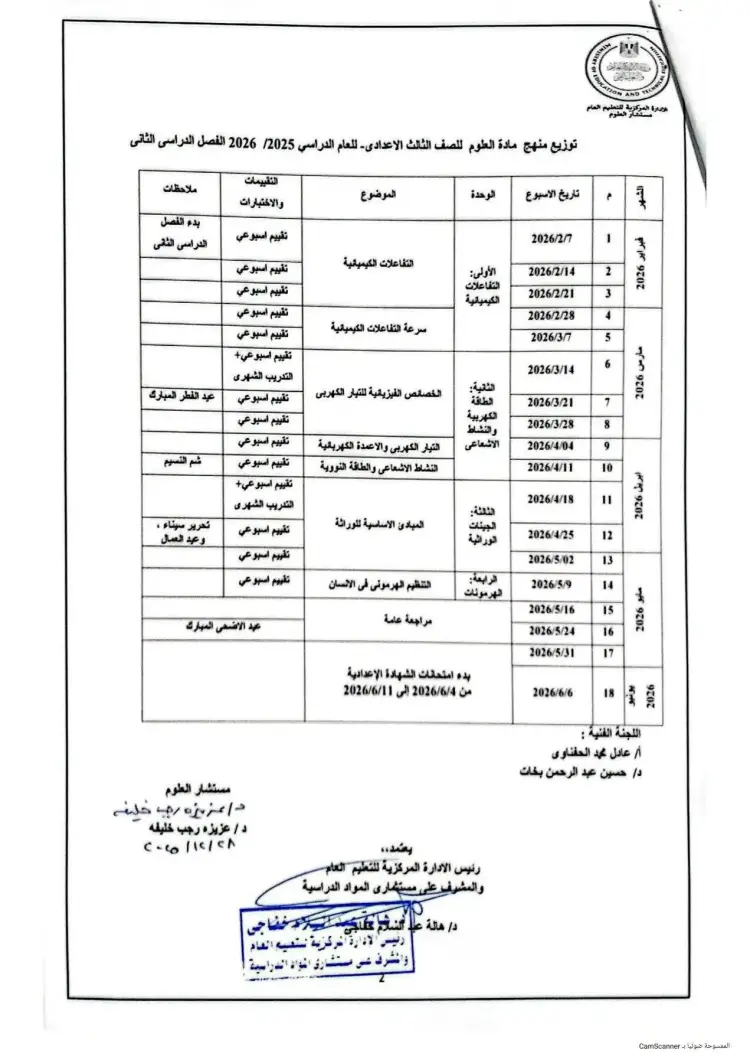 يمكنك التعرف على توزيع منهج العلوم الصف الثالث الإعدادي الترم الثاني 2026 على النحو التالي: